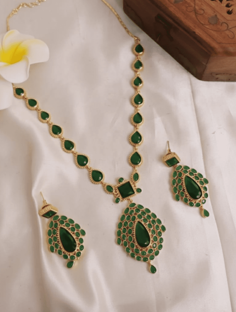 This captivating necklace features a series of green tear-drop stones and a stunning central pendant, with matching earrings.