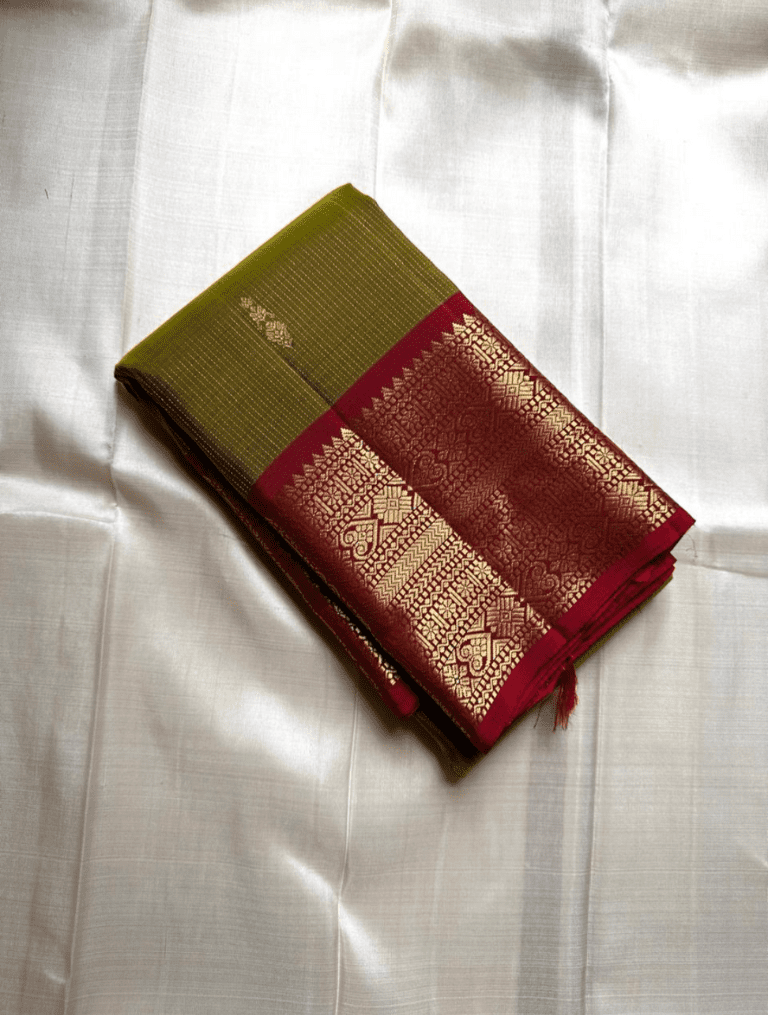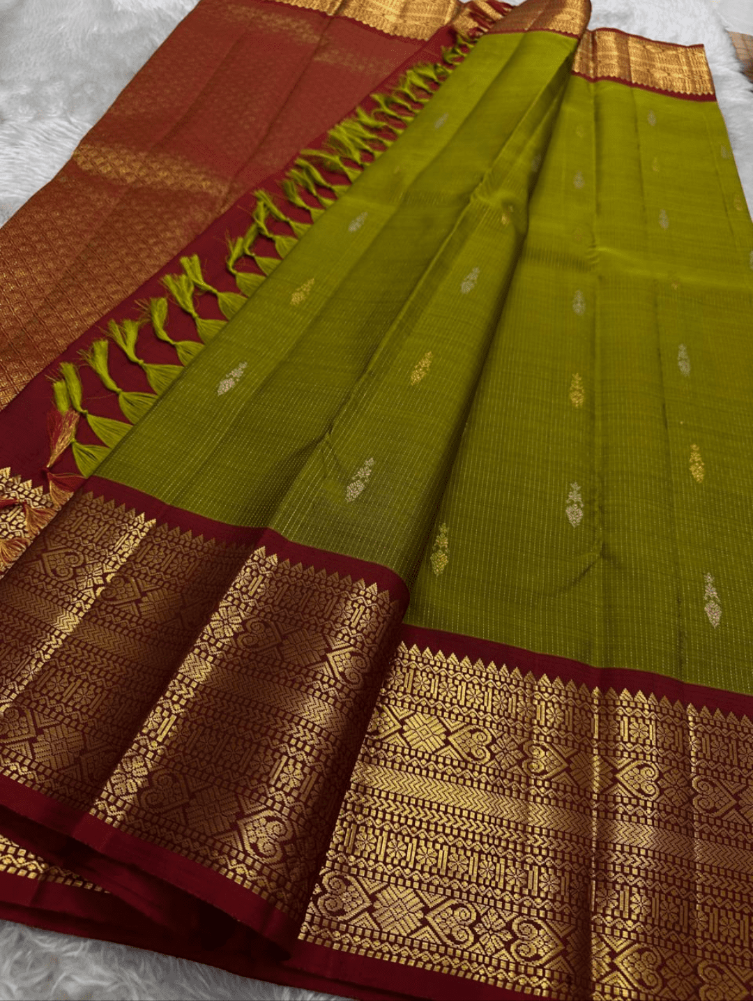 Vasantika is a radiant saree that captures the joyful spirit of springtime. The body, in a fresh lime green, features a delicate, textured stripe and small, scattered motifs that shimmer with light. This lively green is beautifully grounded by a rich maroon border and pallu, both magnificently woven with golden zari. The broad, traditional patterns on the border, from intricate geometrics to classic florals, evoke the timeless beauty of a blooming garden.
