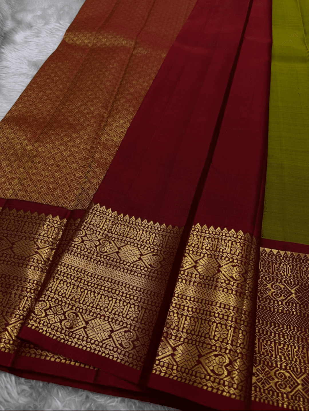Color: A vibrant lime green body with a contrasting deep maroon border and pallu, featuring luminous gold zari work.