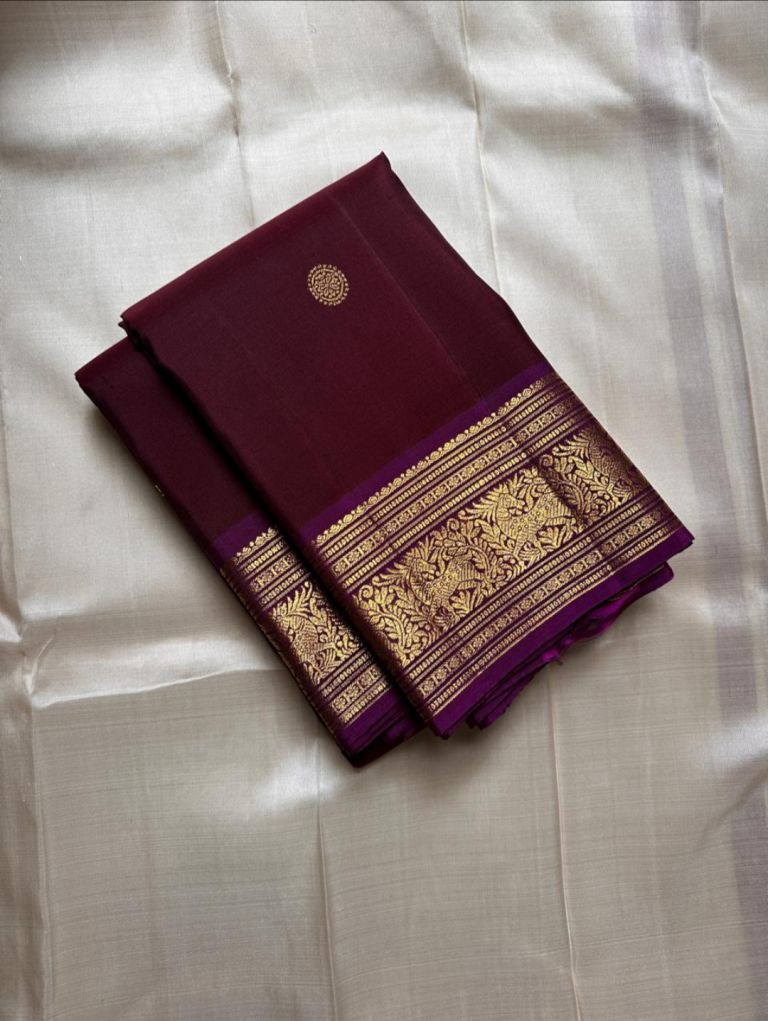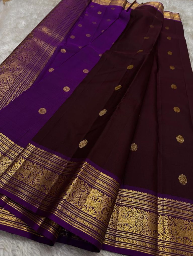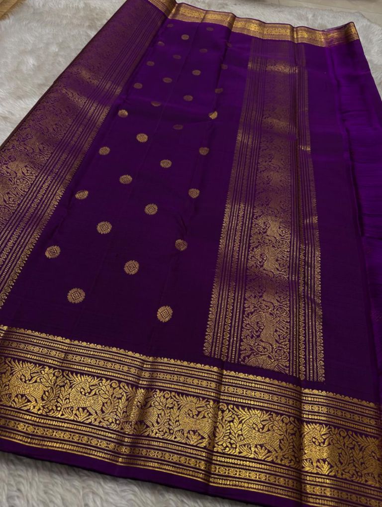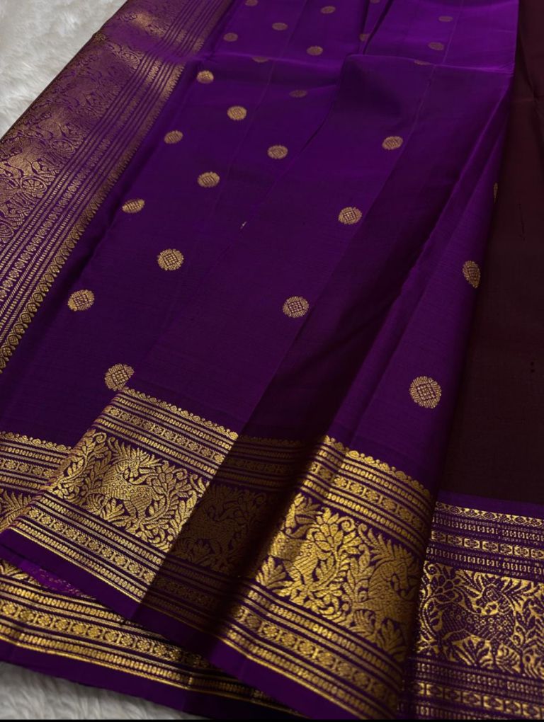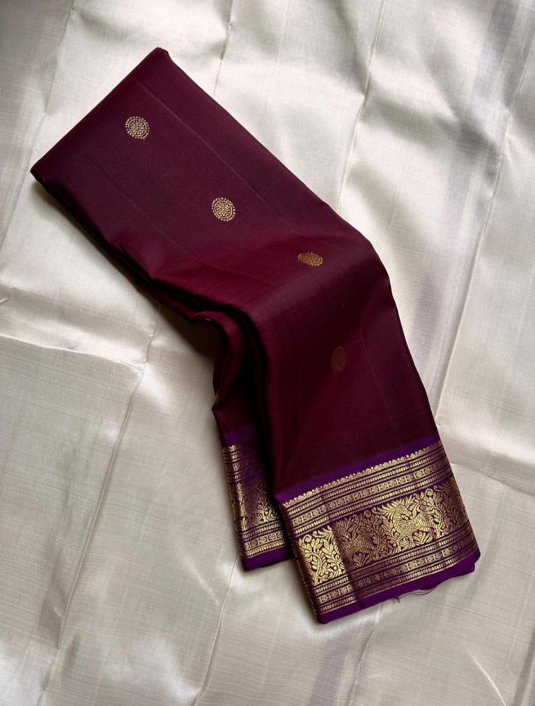 Color: A deep purple body with a contrasting rich maroon border and pallu, and lustrous gold zari.