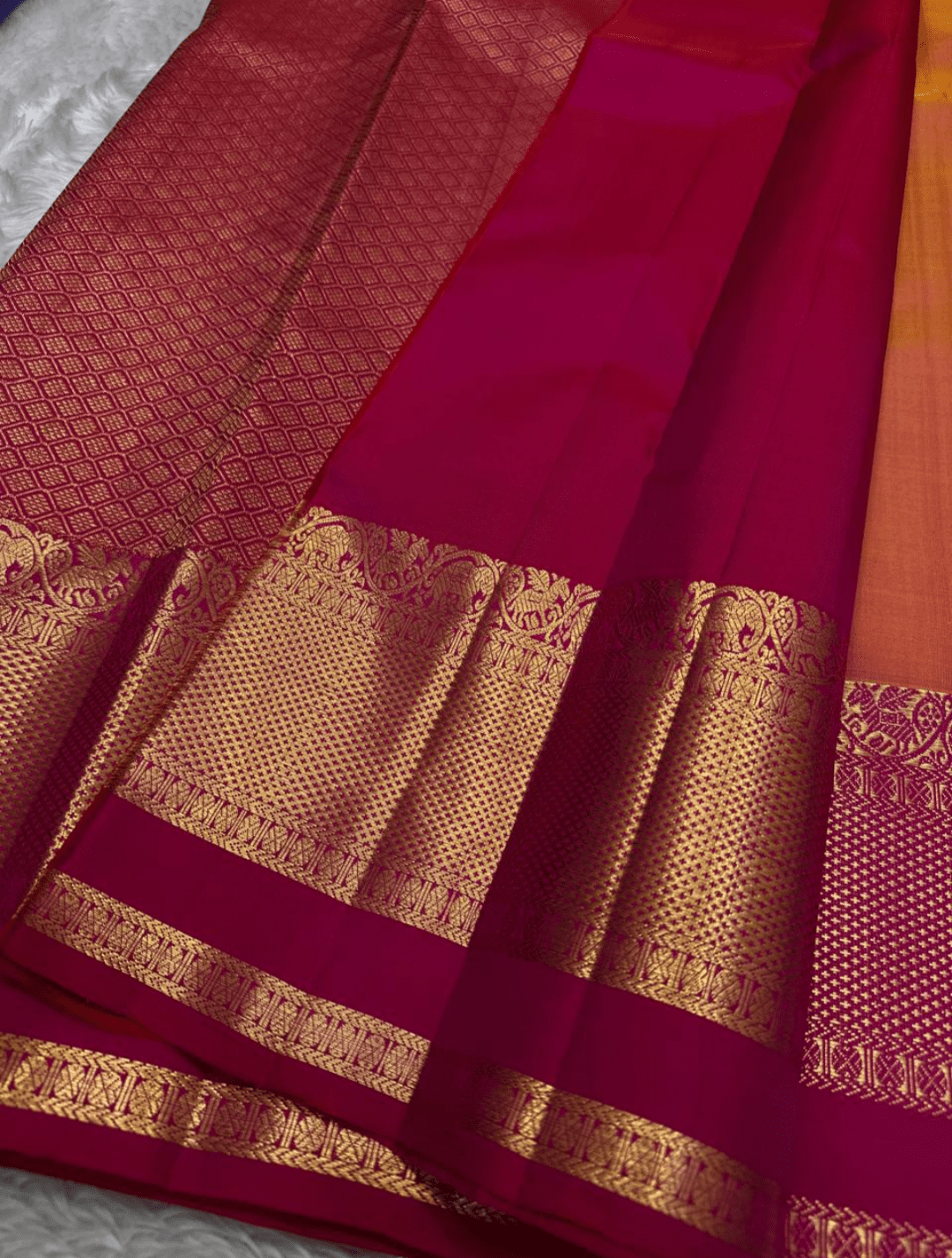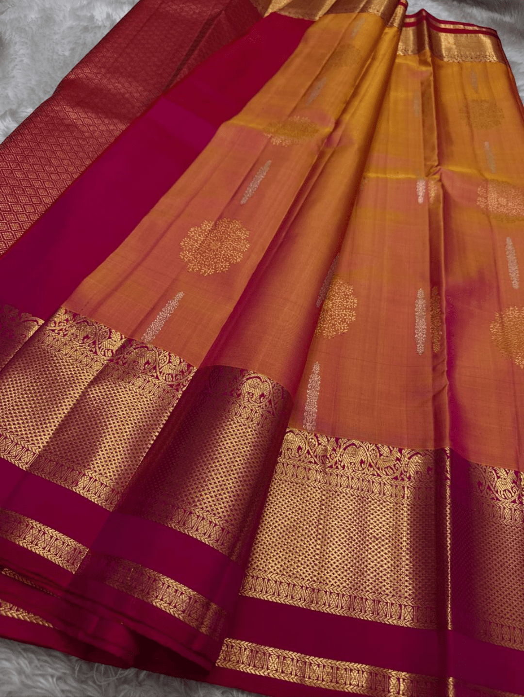 Color: A bright golden-yellow body with a fuschia pink border and pallu, accented by lustrous gold zari.