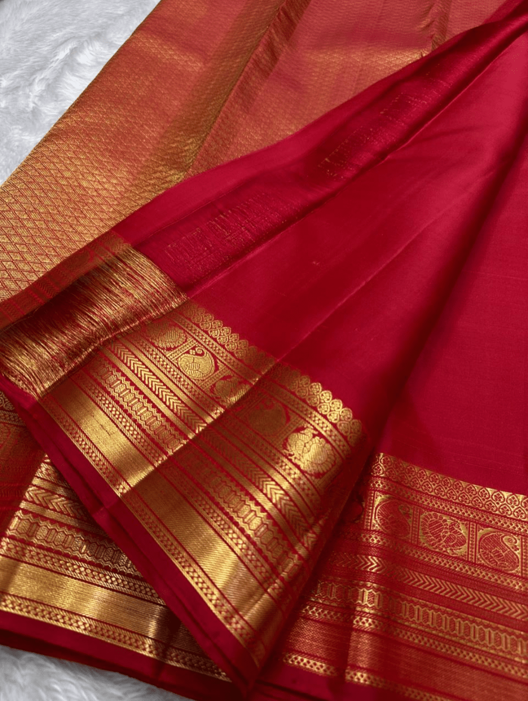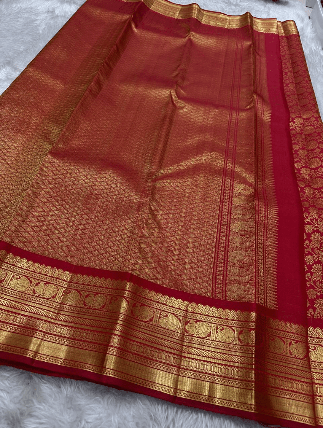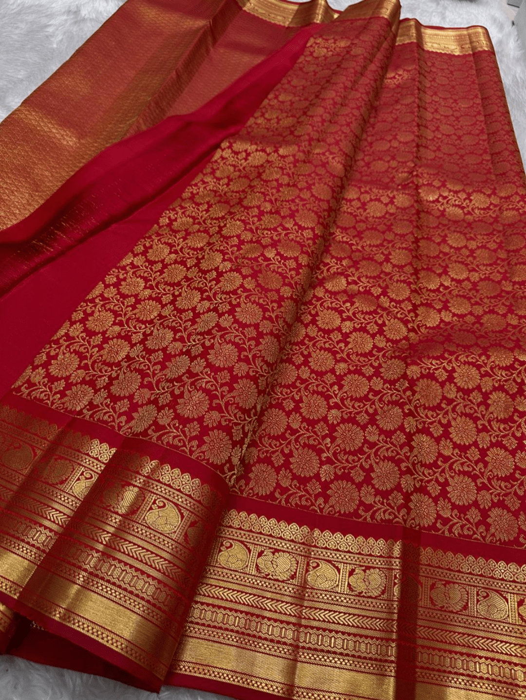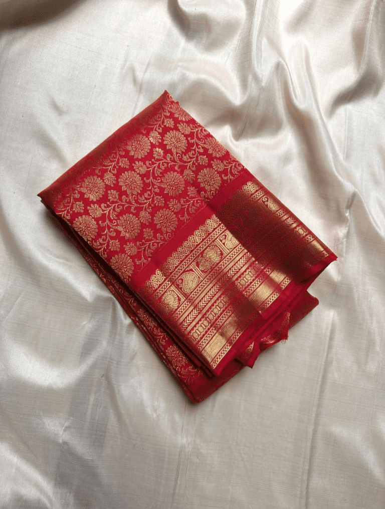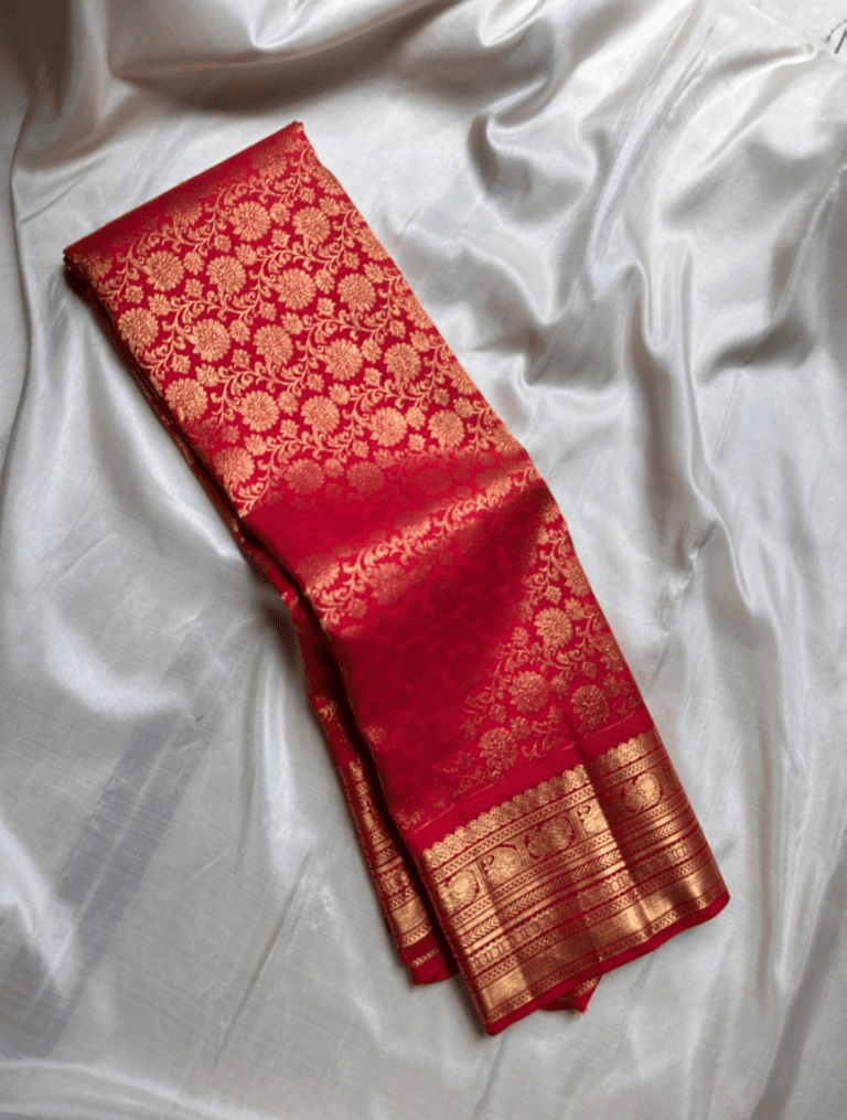 Amulya is a resplendent saree that evokes the beauty of a blooming lotus. Its body is a captivating shade of radiant red, lavishly adorned with an all-over golden floral pattern. This rich design is perfectly framed by a traditional gold zari border featuring delicate peacocks 🦚 and intricate lines, creating a look of classic elegance and grandeur.