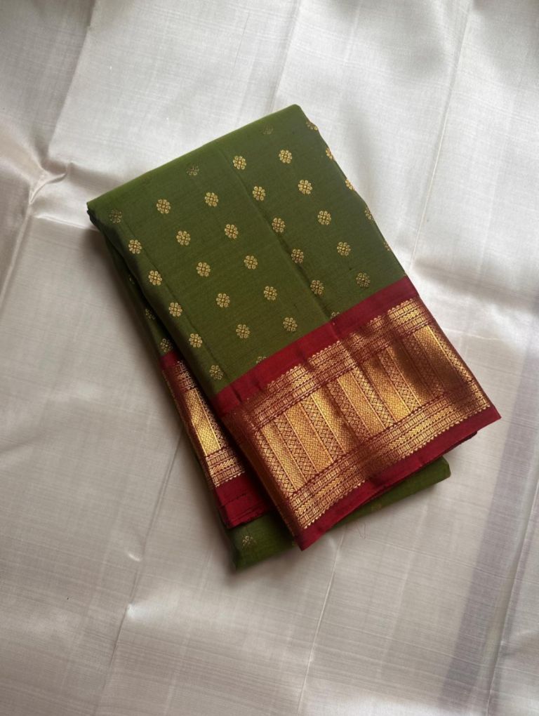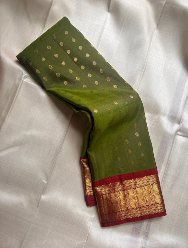 “Anuradha,” a name that signifies radiance and elegance, beautifully complements this enchanting saree. The lush emerald green body is adorned with delicate gold zari buttas, creating a canvas of timeless beauty. Its rich maroon border and grand pallu, intricately woven with temple-inspired zari designs.