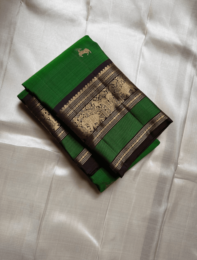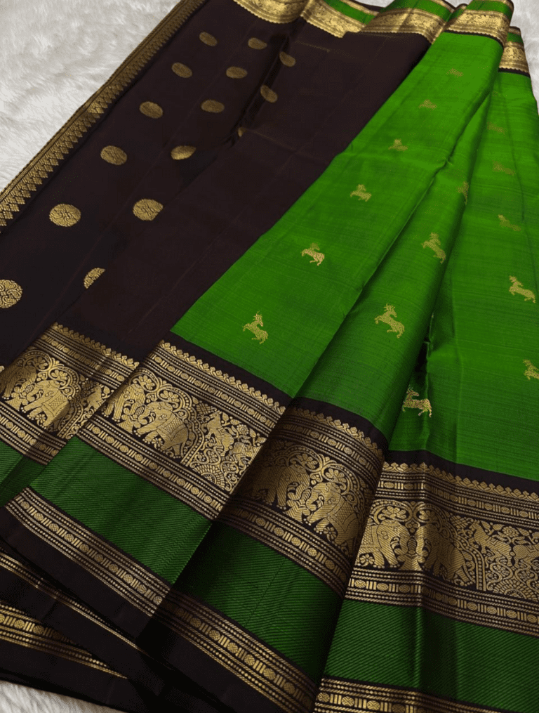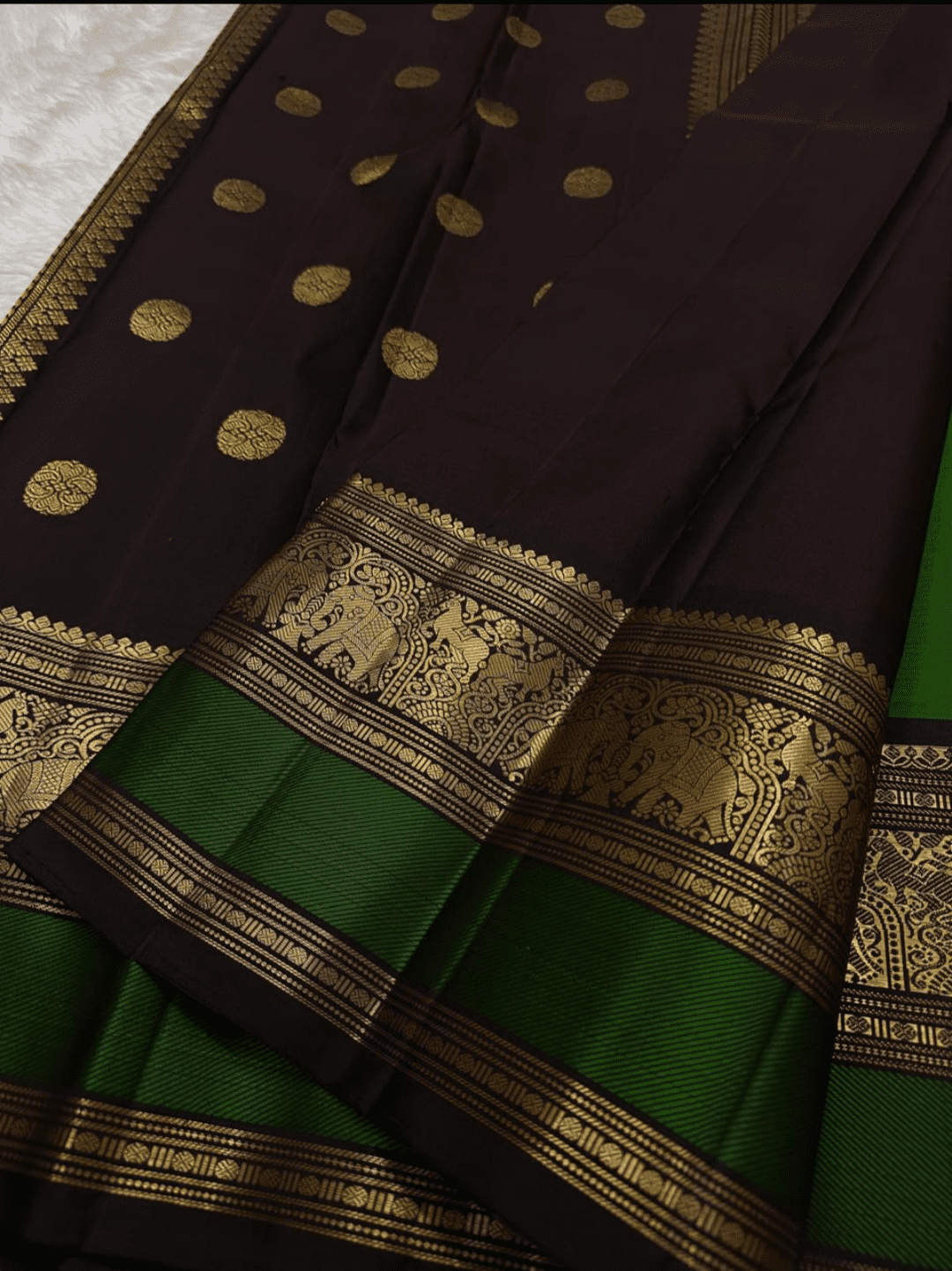 Color: A rich dark brown body with a striking green pallu and border, intricately woven with golden zari.
