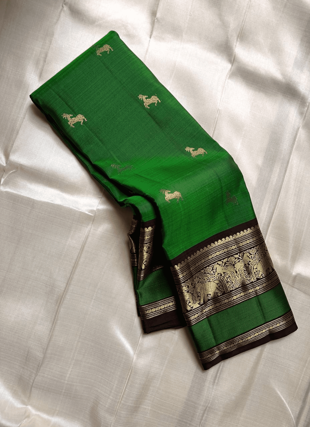 Bhumi is a traditional masterpiece that pays homage to the bountiful earth and nature’s vivid colors. The saree features a deep brown body, symbolizing the richness of the soil, adorned with golden polka dots that sparkle like tiny treasures. This earthy hue is beautifully offset by a bright green pallu and border, representing new life and lush greenery. The aal-over broad border is a stunning display of traditional weaving, featuring intricate golden zari work with motifs of elephants and deer . This design is a classic example of traditional Indian textiles, embodying grace, heritage, and timeless beauty.