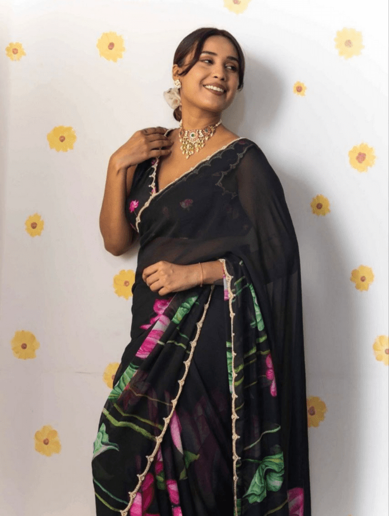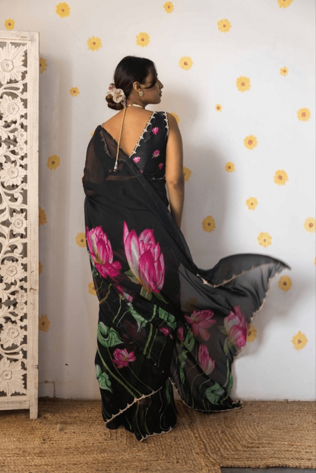 Black sheer saree with large pink lotus flower prints. It features a delicate scalloped gold border. The blouse is a sleeveless, deep scalloped V-neck with a back dori (tie-up).