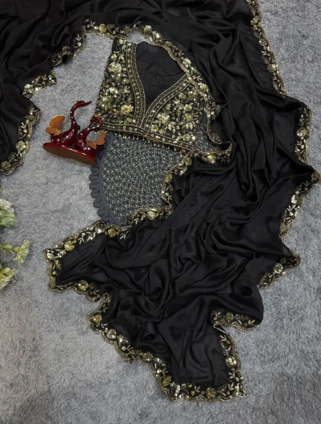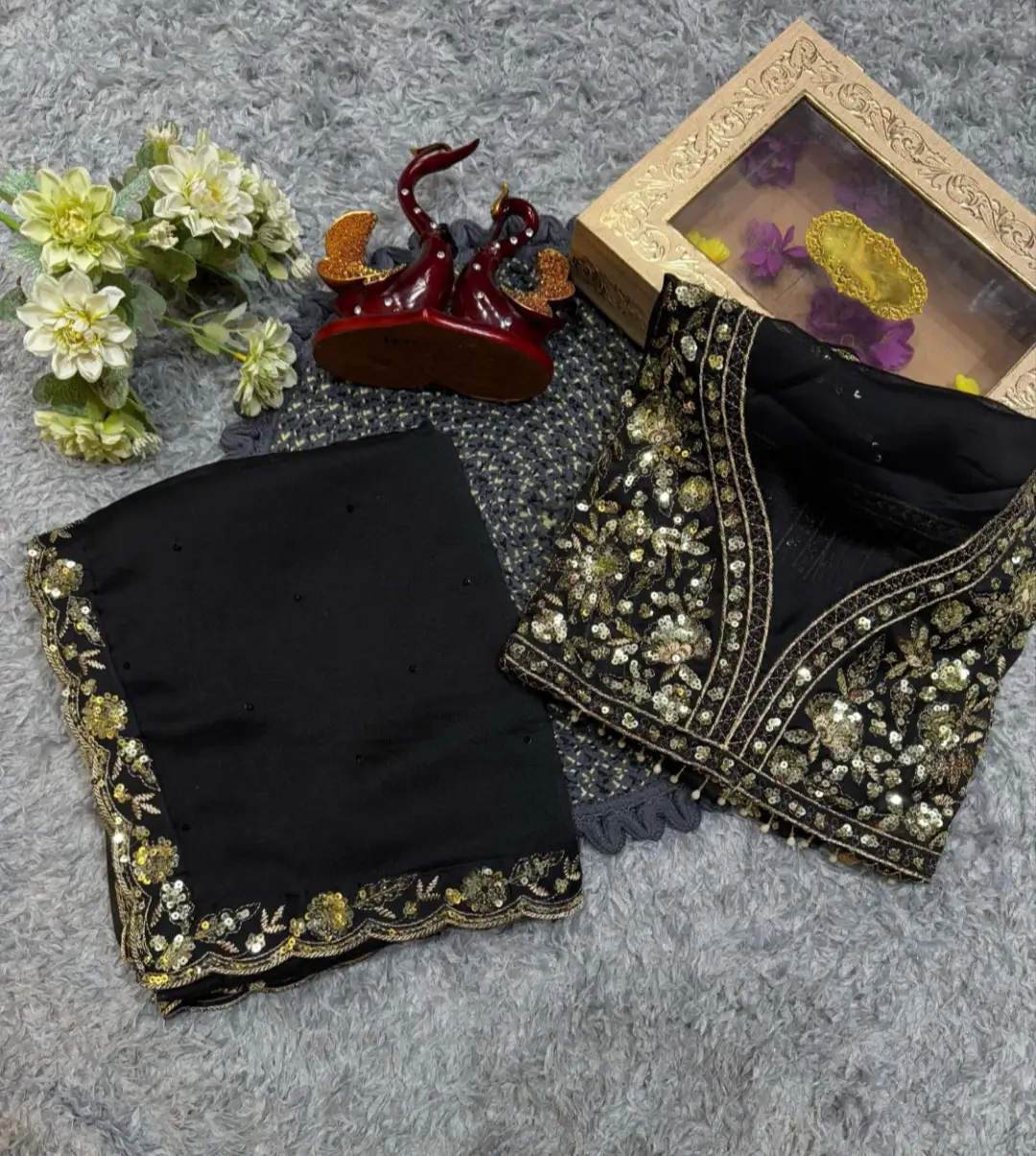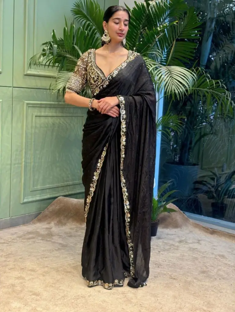 Black saree with subtle texture and an ornate gold sequin and bead border. The blouse is a three-quarter sleeve, plunging V-neck design, heavily covered in gold and sequin work.