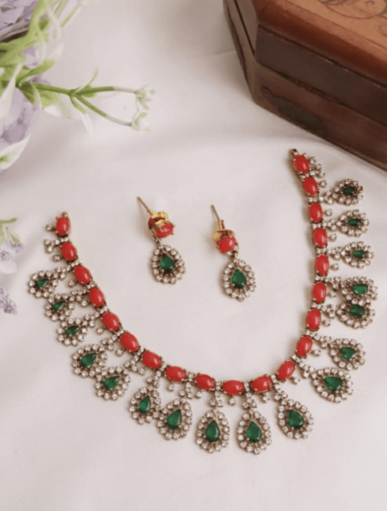 This choker-style necklace has a graceful chain of red coral stones and teardrop pendants with green stones.