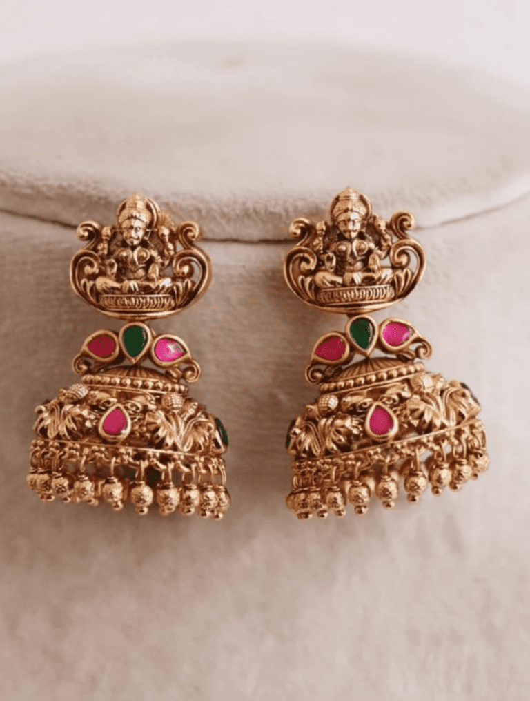 Antique gold-plated ornaments with a traditional divine motif, featuring pink and green stones and gold bead drops.