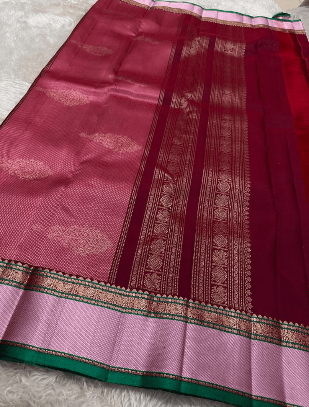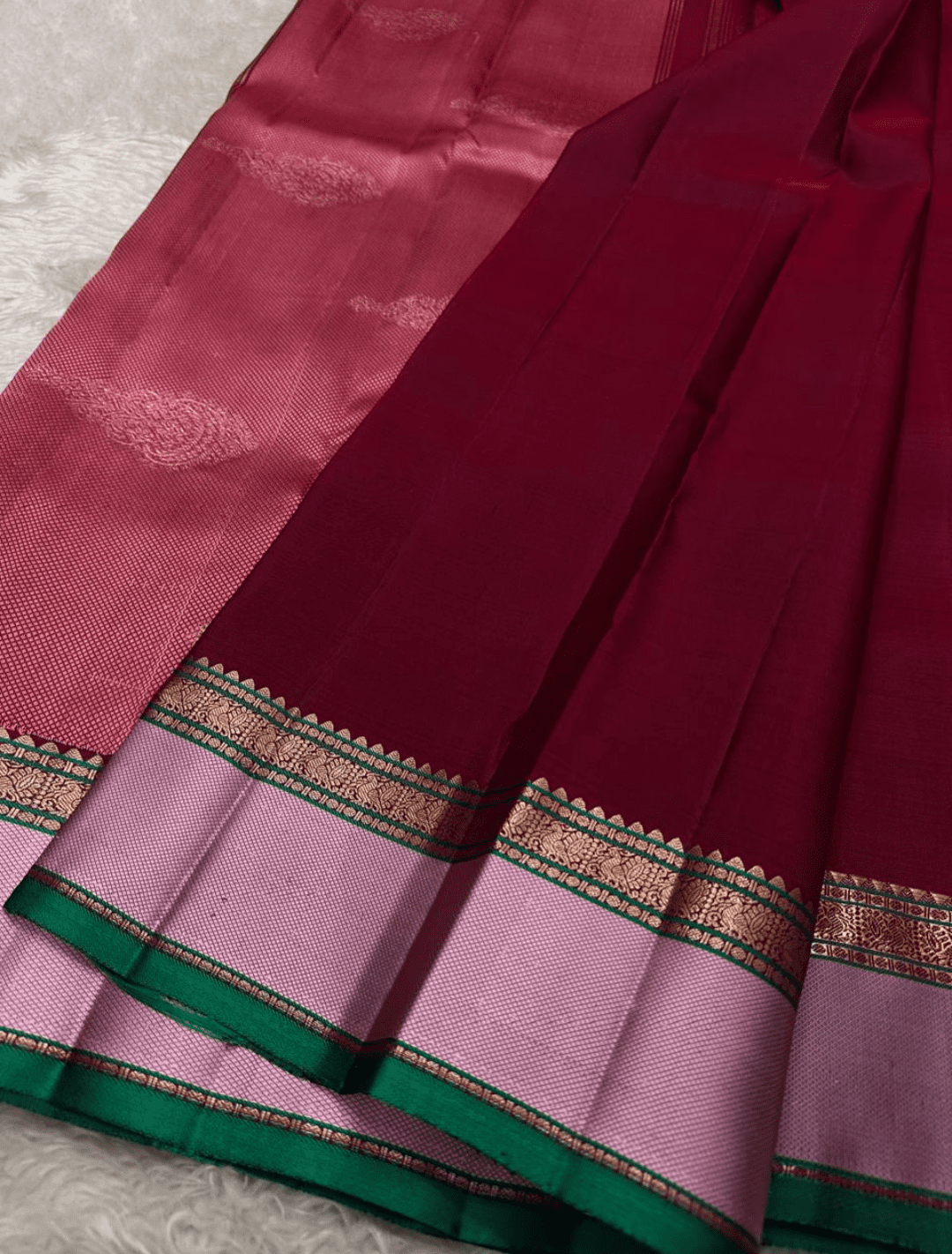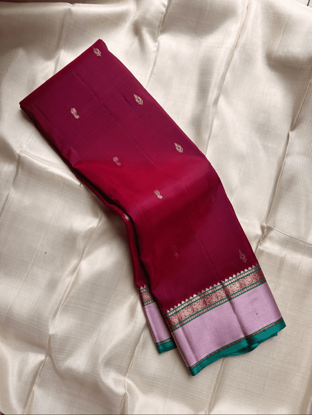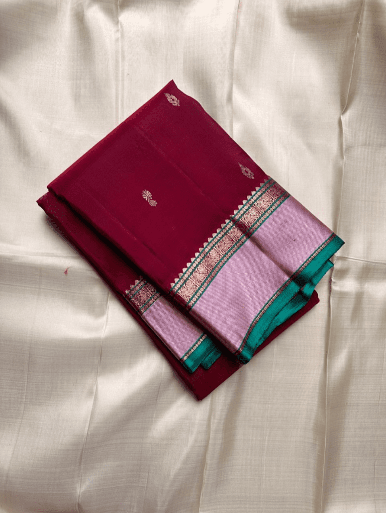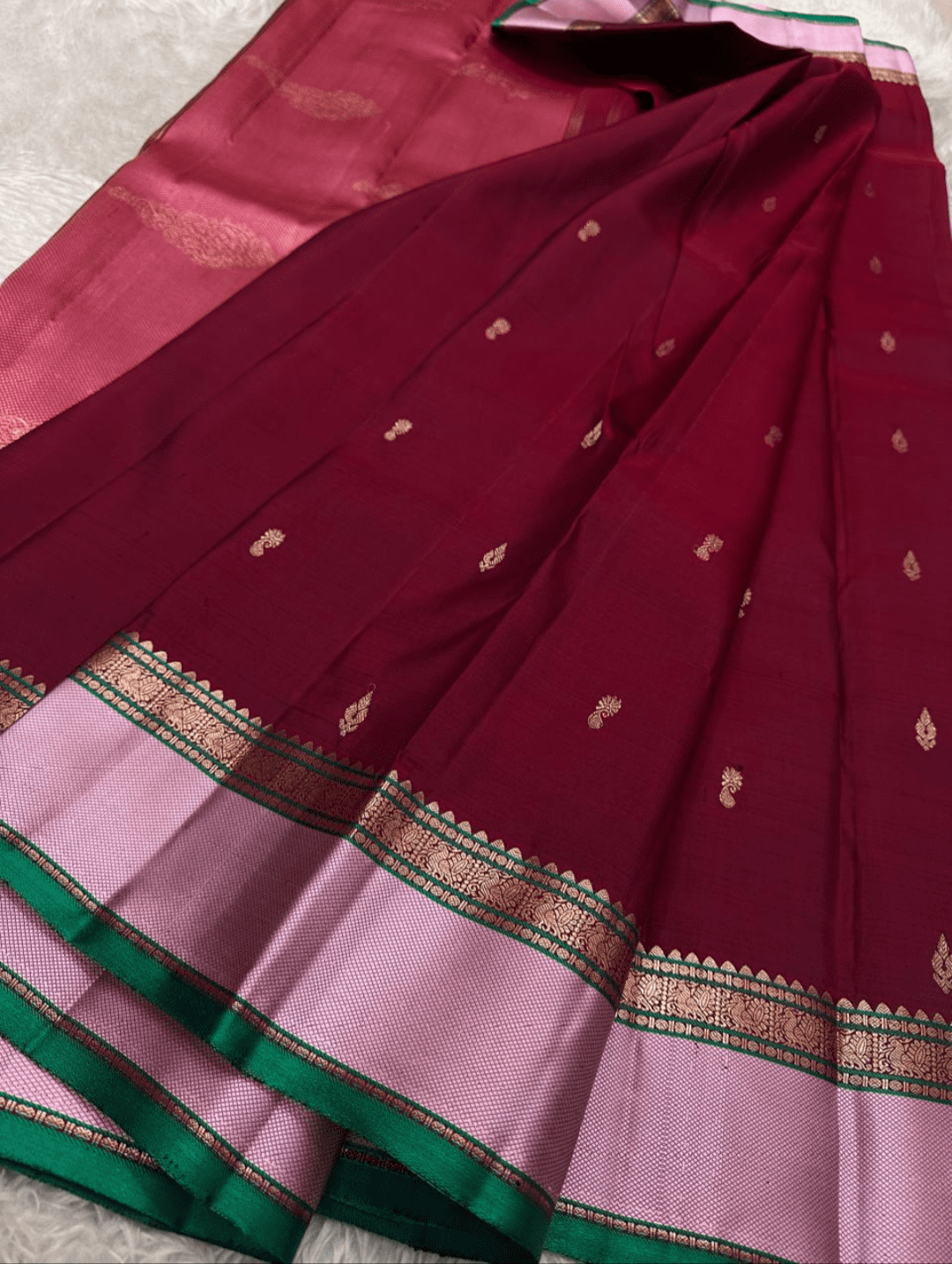 Deep Wine Red/Maroon body with delicate Gold Zari buttis (motifs) all over.