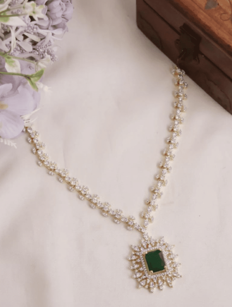This elegant necklace has a floral chain and a prominent, square-cut green stone pendant surrounded by sparkling clear stones.