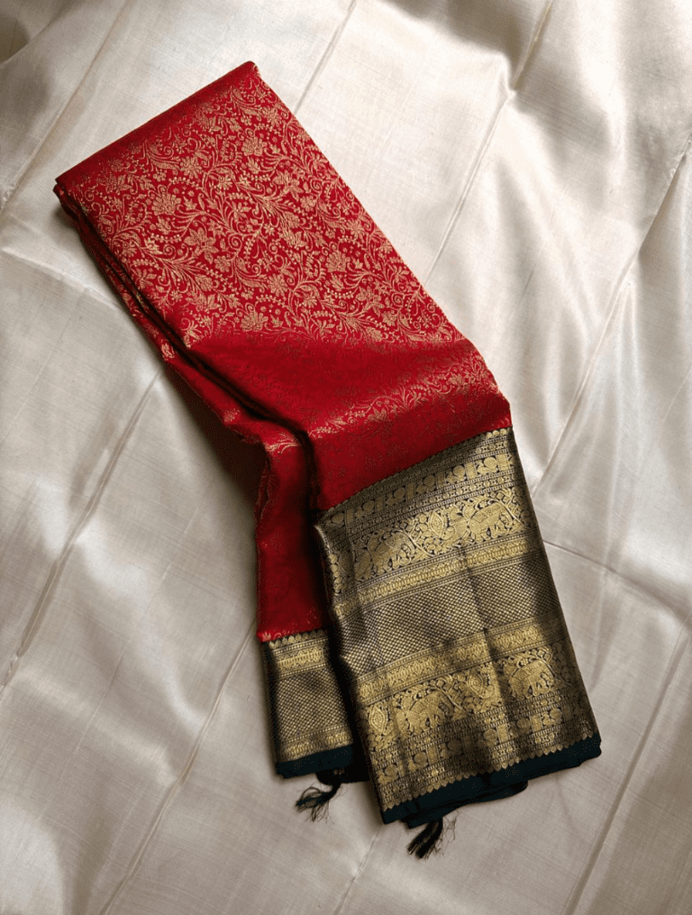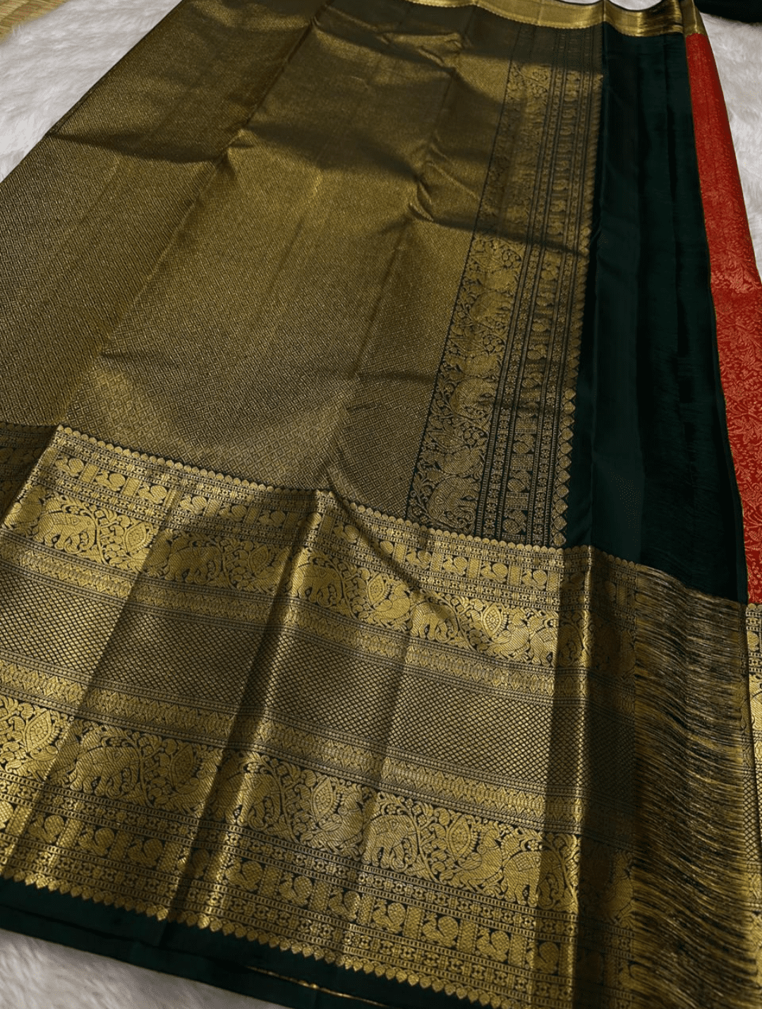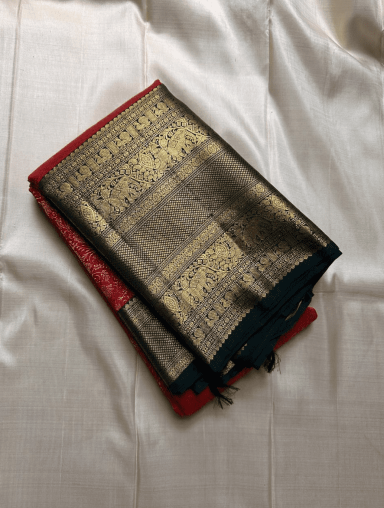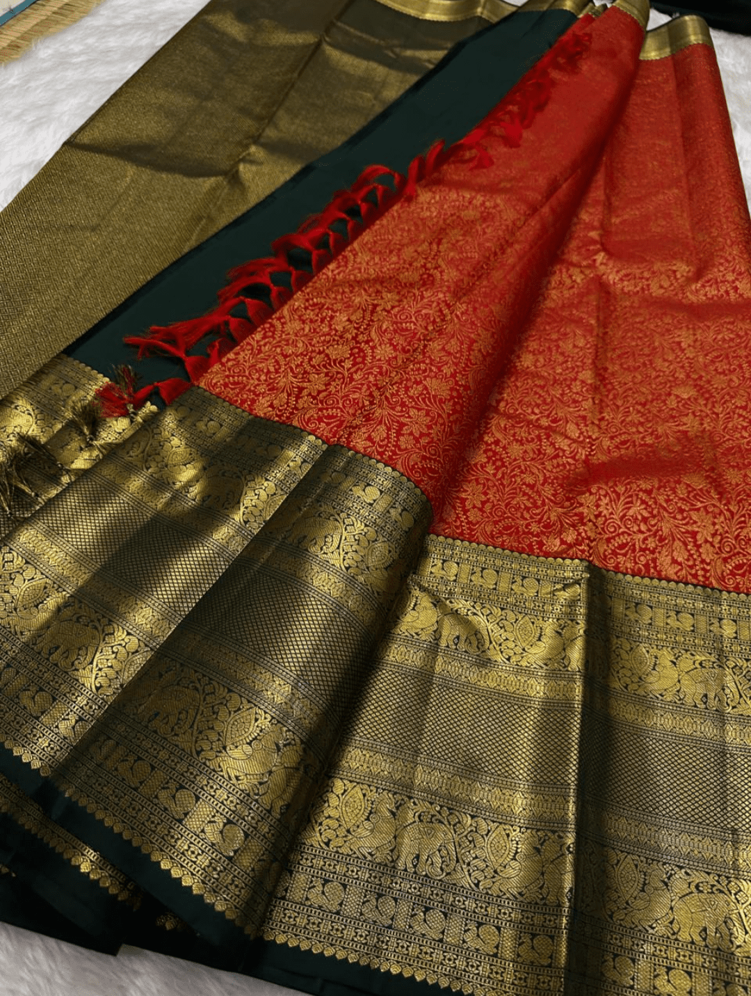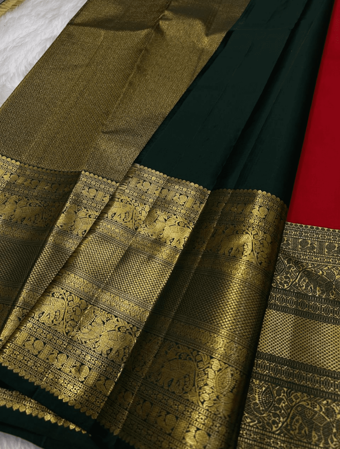 This saree is a vibrant masterpiece of crimson and forest green. The body is intricately woven with a contrast of the green border and pallu. The wide gold zari border, adorned with peacocks and florals, adds a timeless elegance.