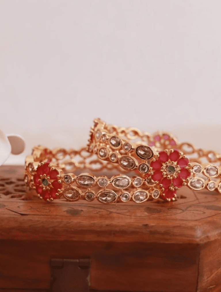 Design: A pair of gold-toned bangles, each featuring a prominent flower motif with pink petals and a green center. The rest of the bangle is adorned with a series of sparkling white stones.