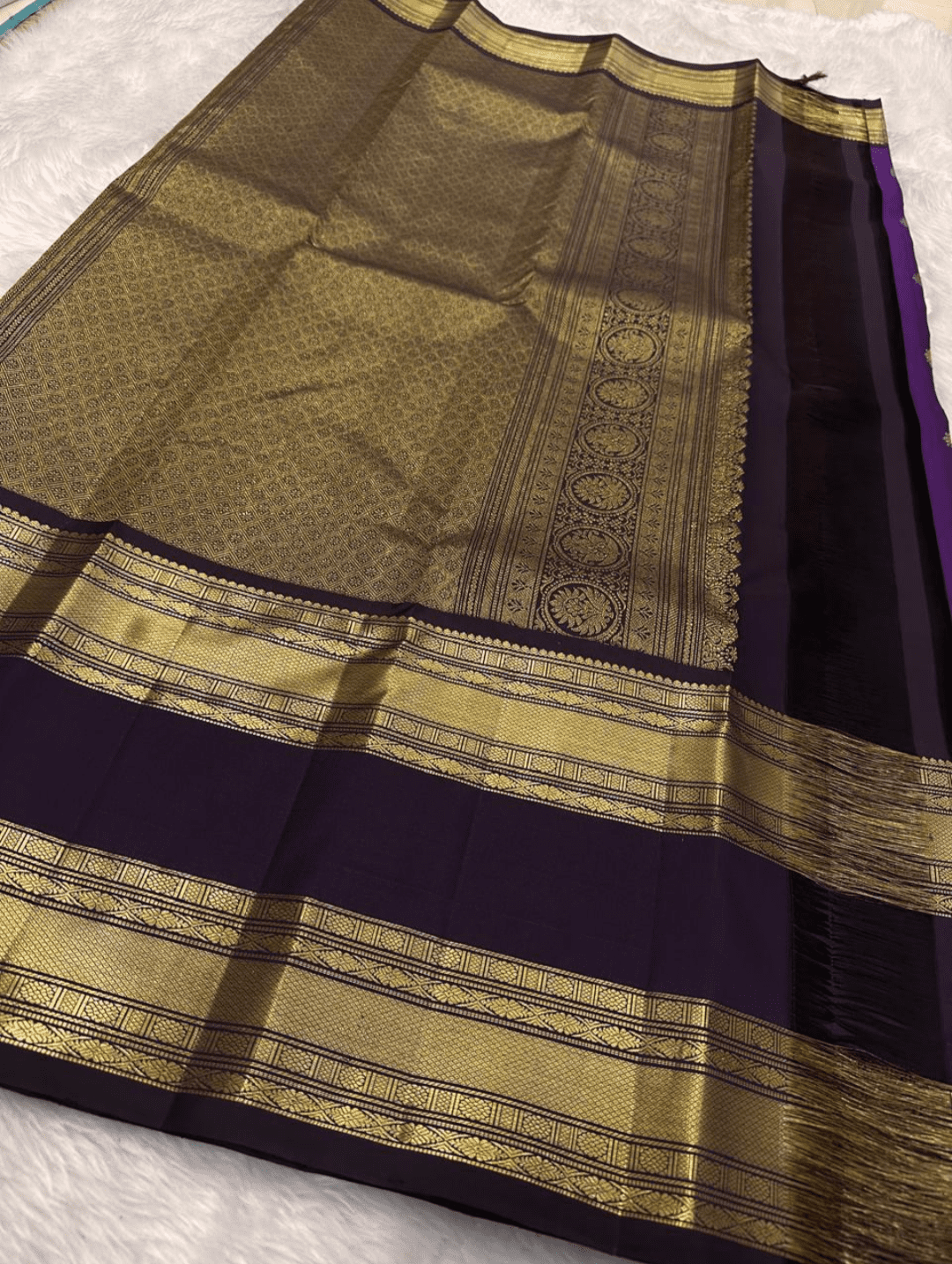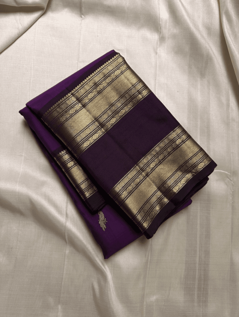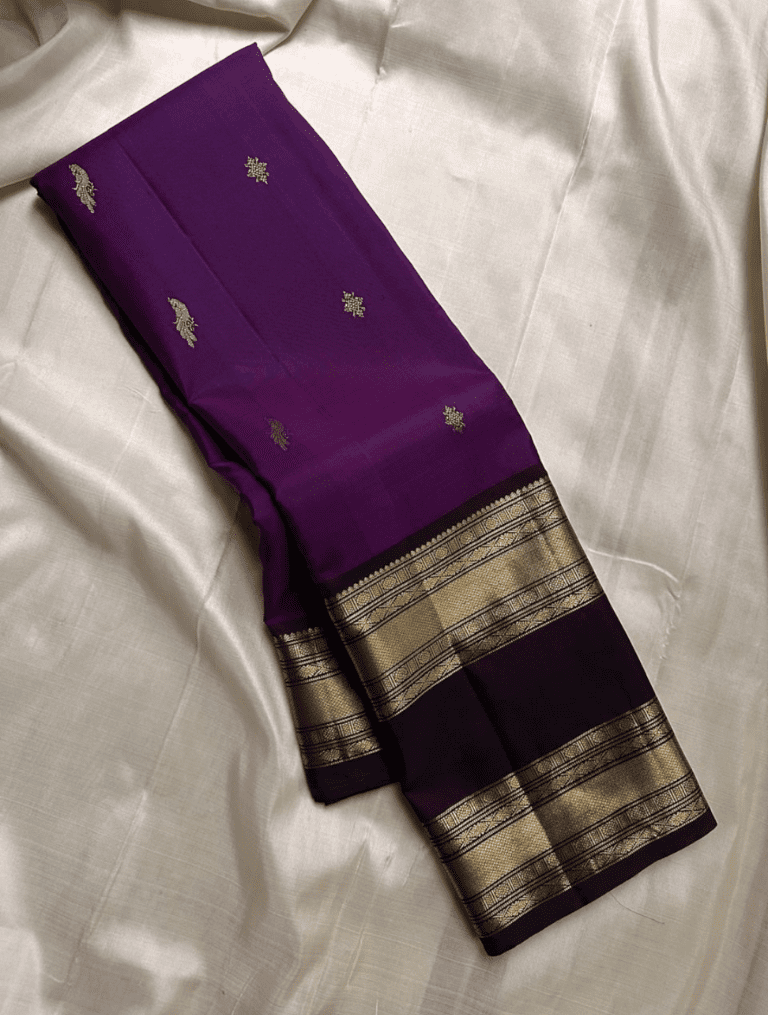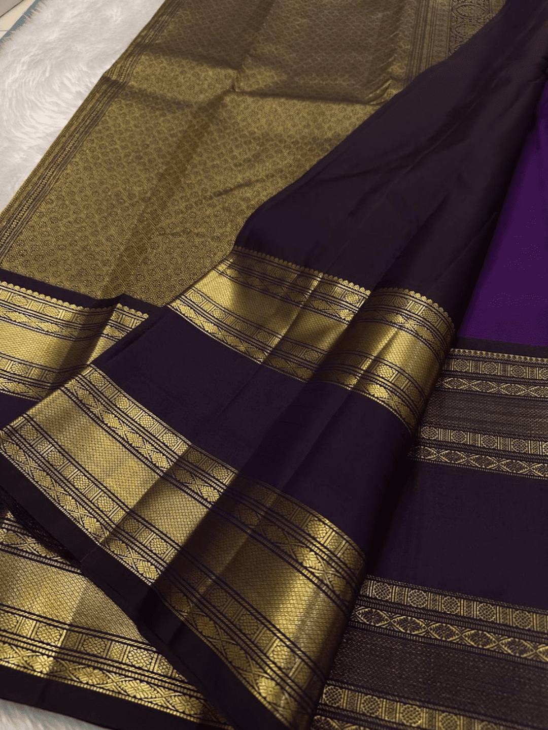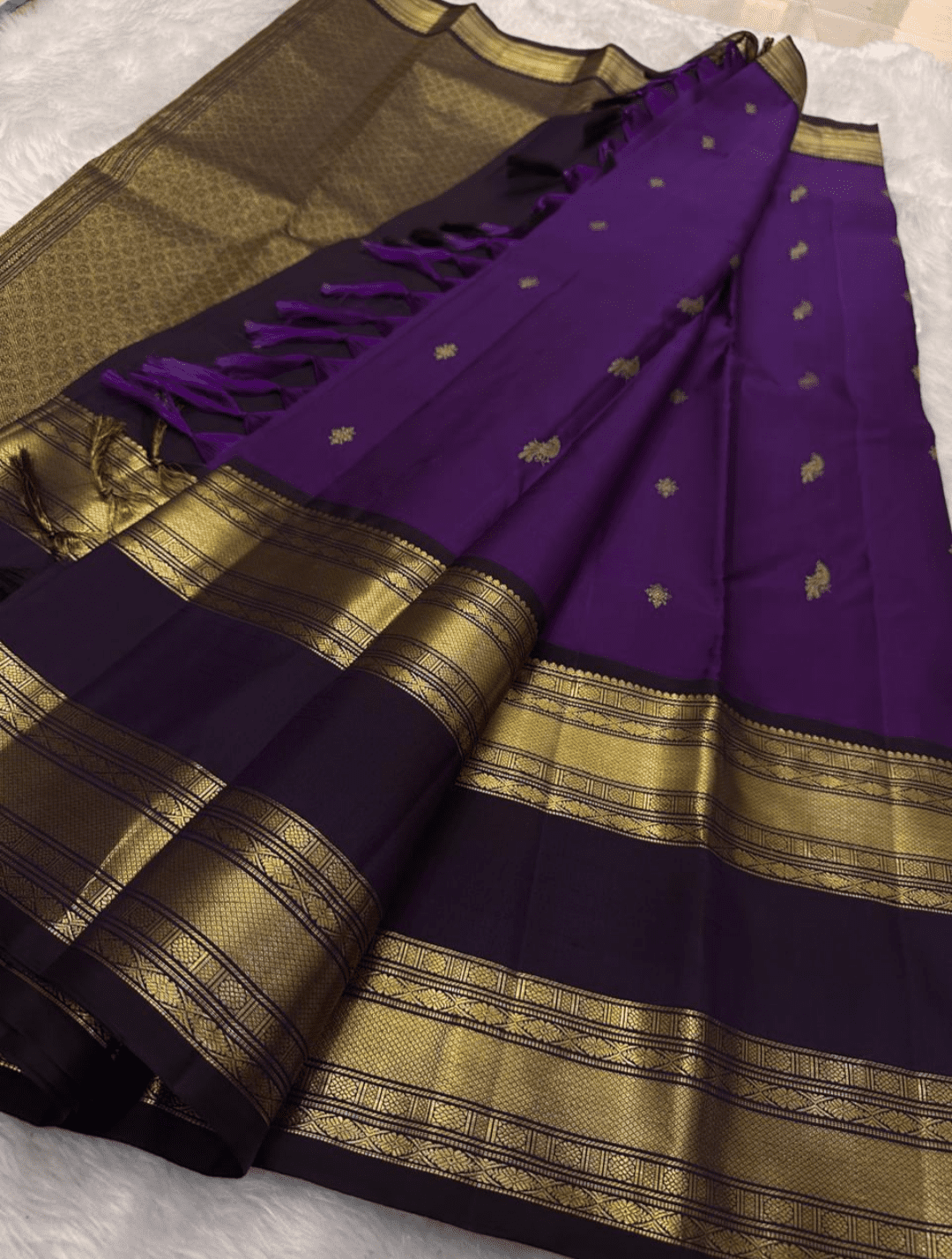 Indira is a traditional purple saree with delicate golden floral motifs. It features a wide black border with intricate golden zari work and golden tassels on the pallu, blending rich color with classic design.