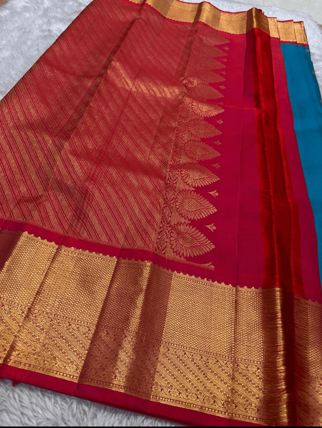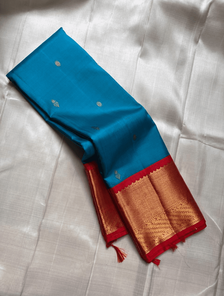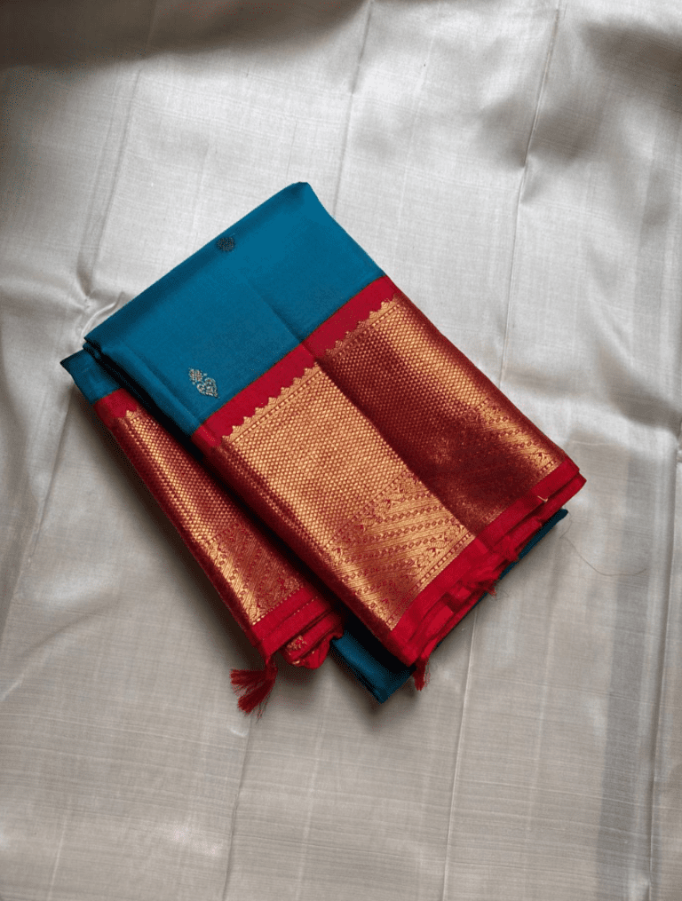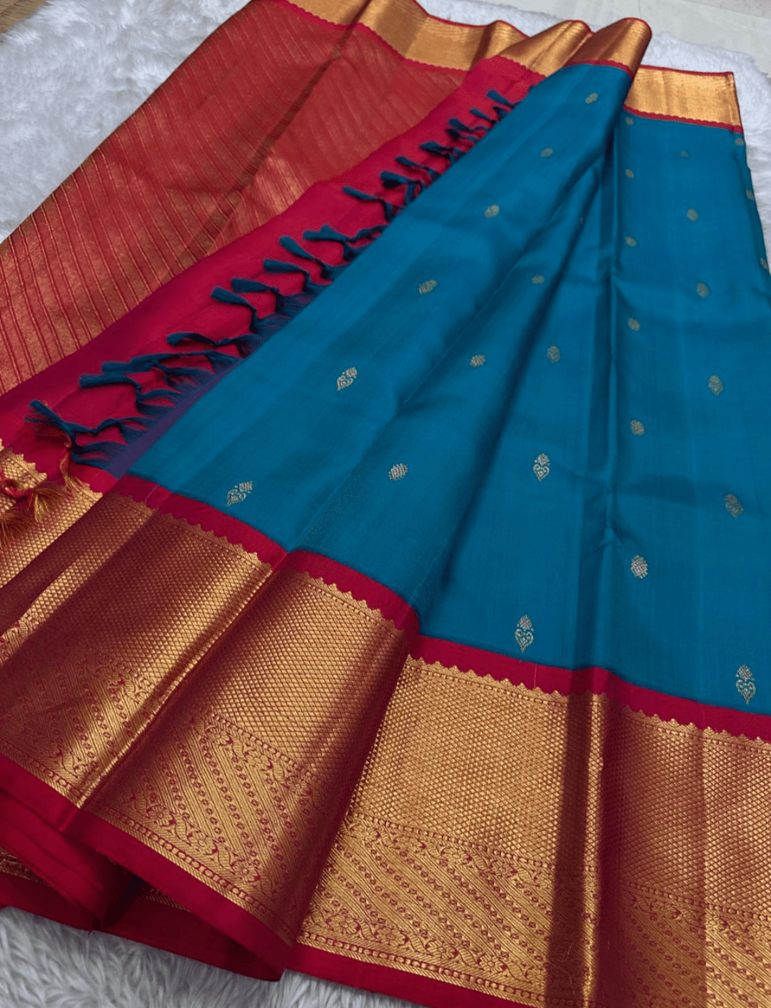 The ‘Indrajaala’ saree, meaning ‘magical’ or ‘charming,’ is a truly mesmerizing piece. Its striking aqua blue body, adorned with subtle golden buttas, is beautifully complemented by a vibrant fuchsia pink pallu and border. The wide, intricate border, woven in rich gold zari, features a classic temple design, creating a stunning and unique contrast.