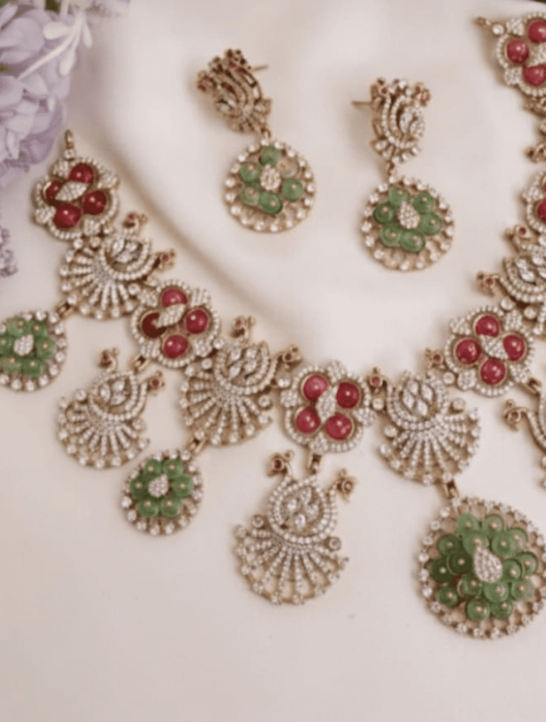 This captivating choker has a beautiful peacock and floral design with red, green, and sparkling white stones. It comes with matching earrings.