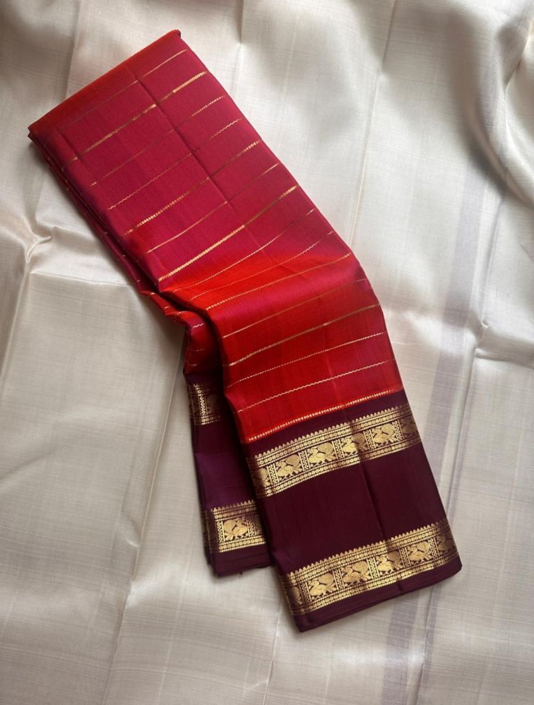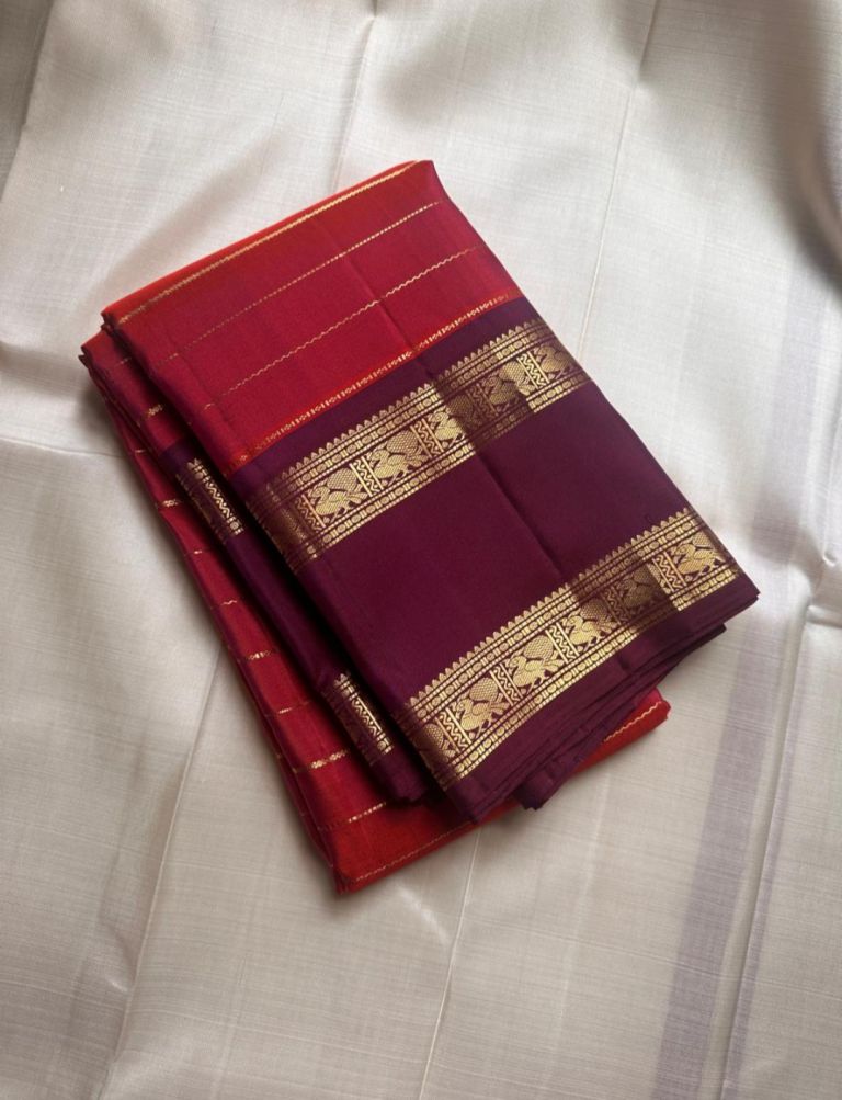 “Iravya” – means Night beauty, symbol of depth and elegance. Iravya is a striking Kanjivaram saree that radiates sophistication and grace. The body in a rich plum shade is elevated by a vibrant red contrast pallu, creating a bold yet elegant combination. Its golden zari border, finely detailed with traditional motifs and patterns, adds a regal finish.