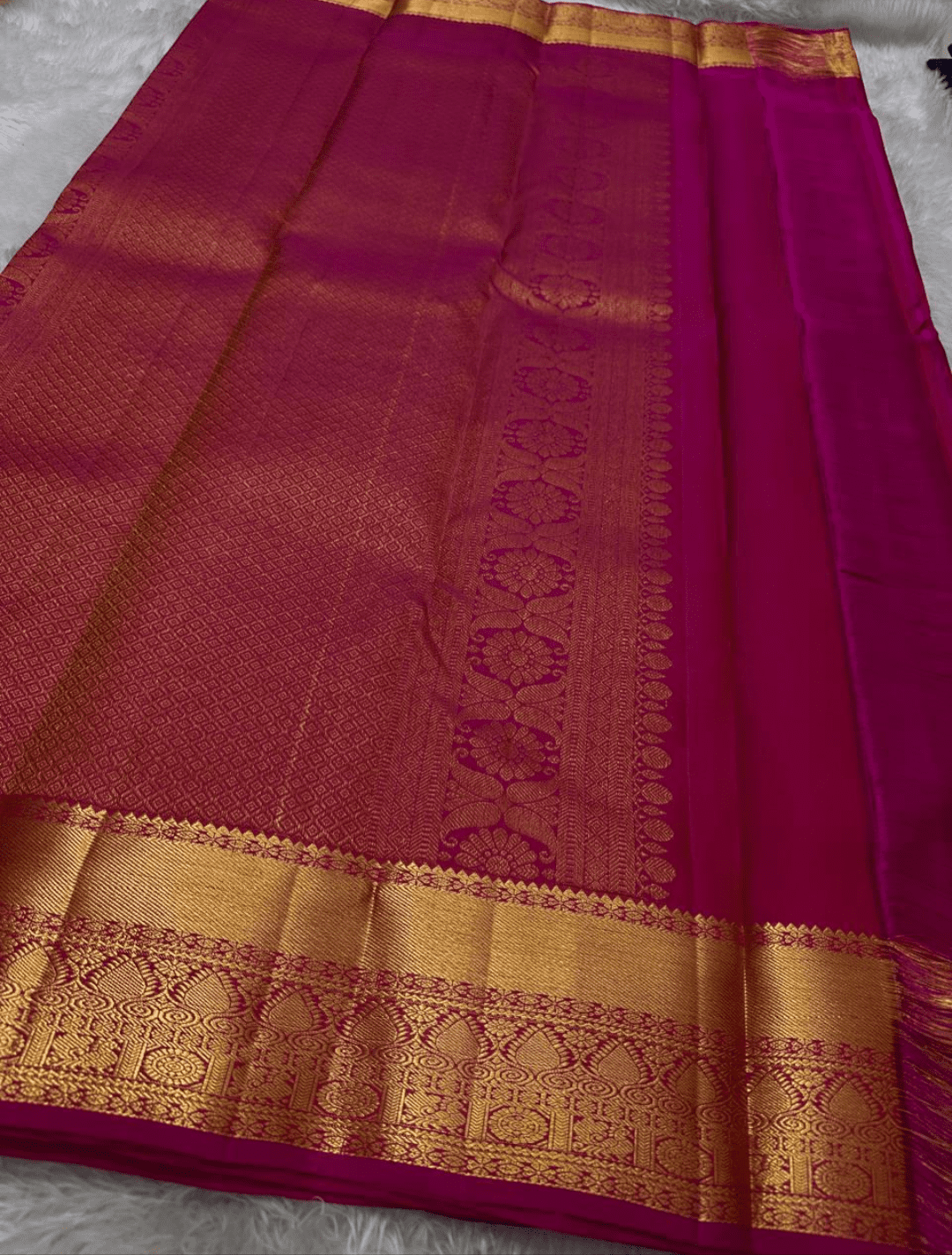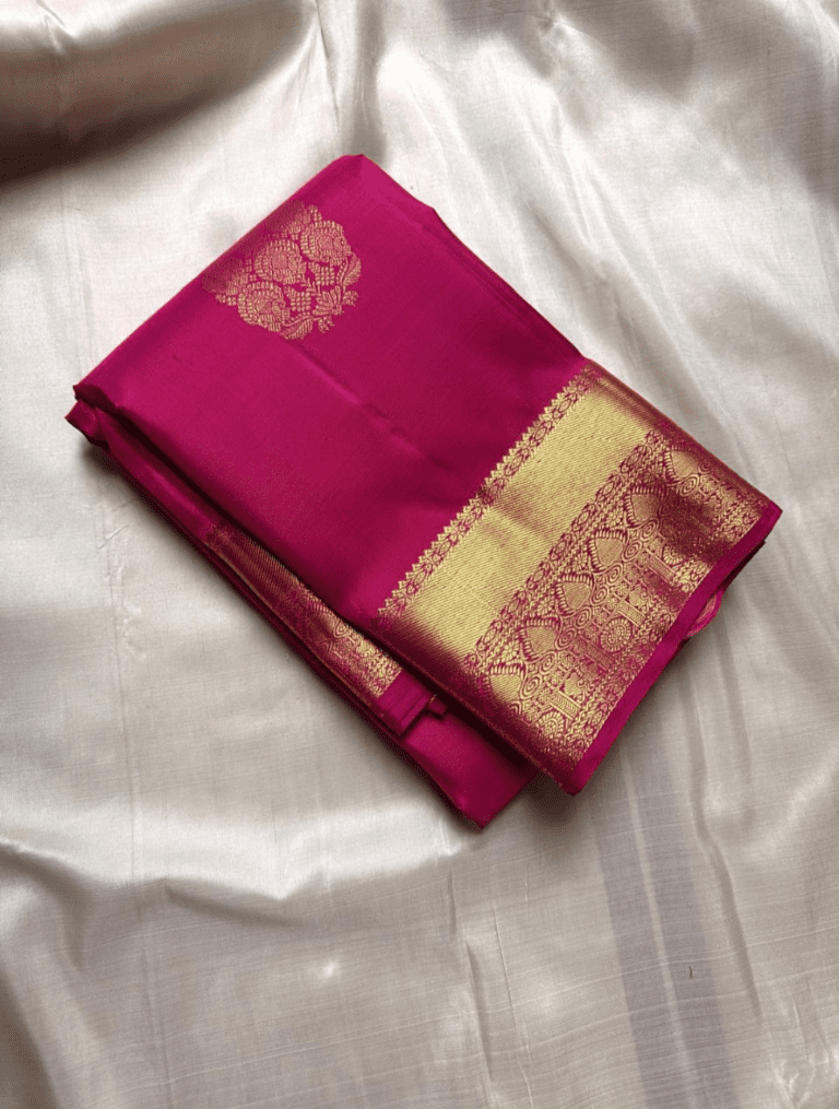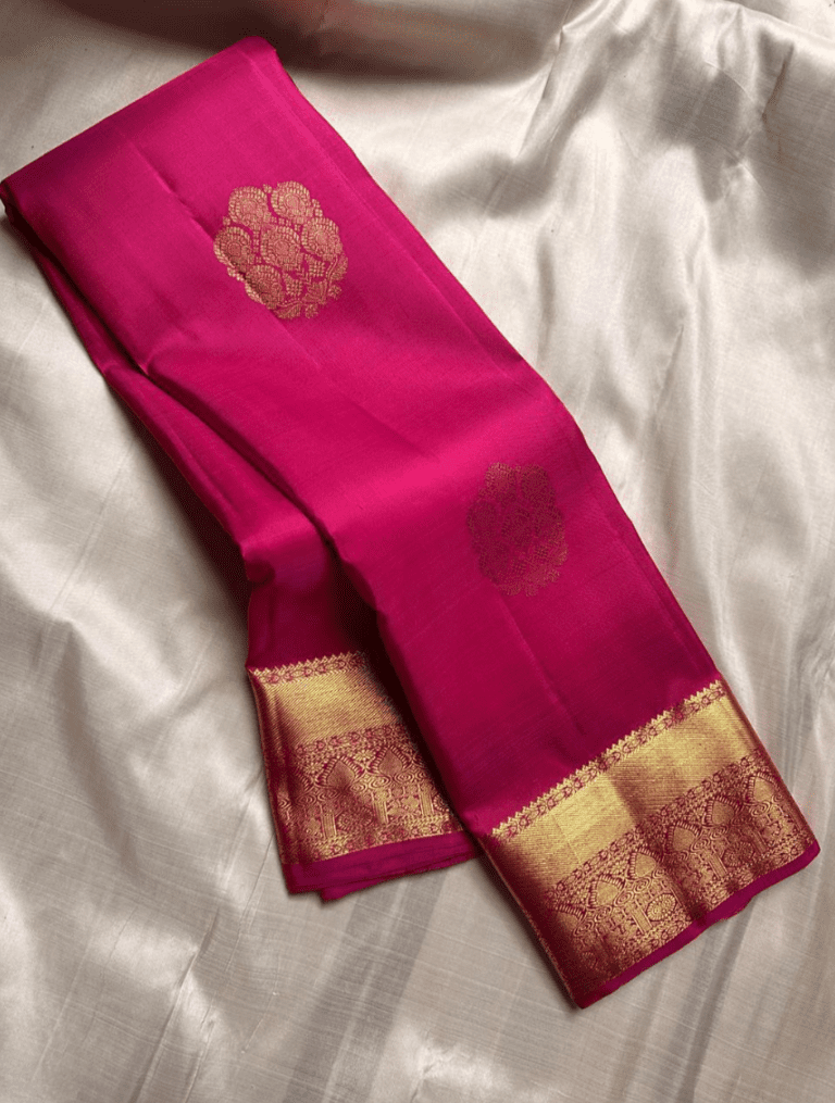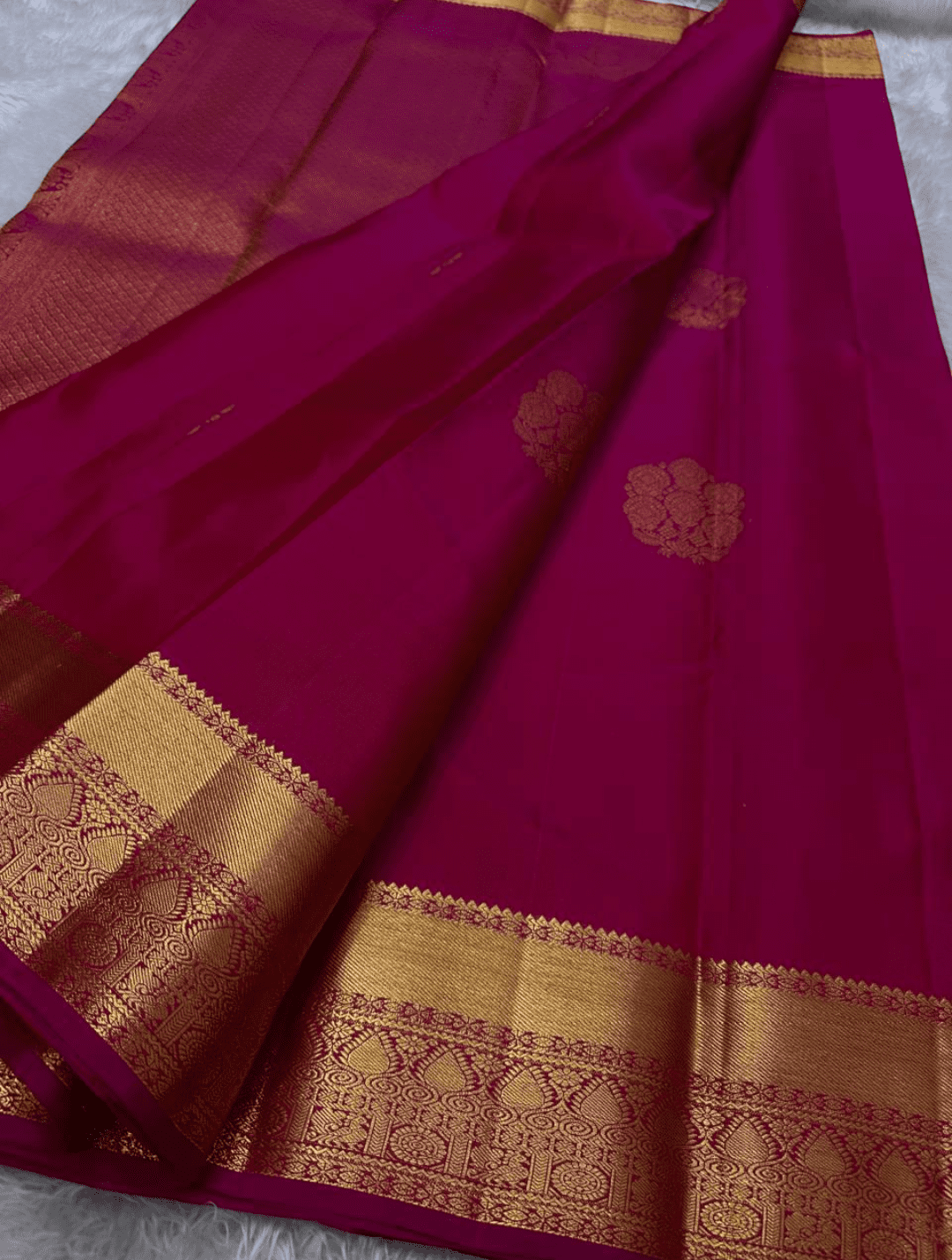 The ‘Madhumathi’ saree, meaning ‘full of honey’ or ‘sweet,’ is as beautiful as its name suggests. The bright magenta body is adorned with intricate gold buttas, creating a vibrant yet elegant look. The wide, elaborate golden border features detailed paisley and floral motifs, giving this saree a truly rich and festive feel.