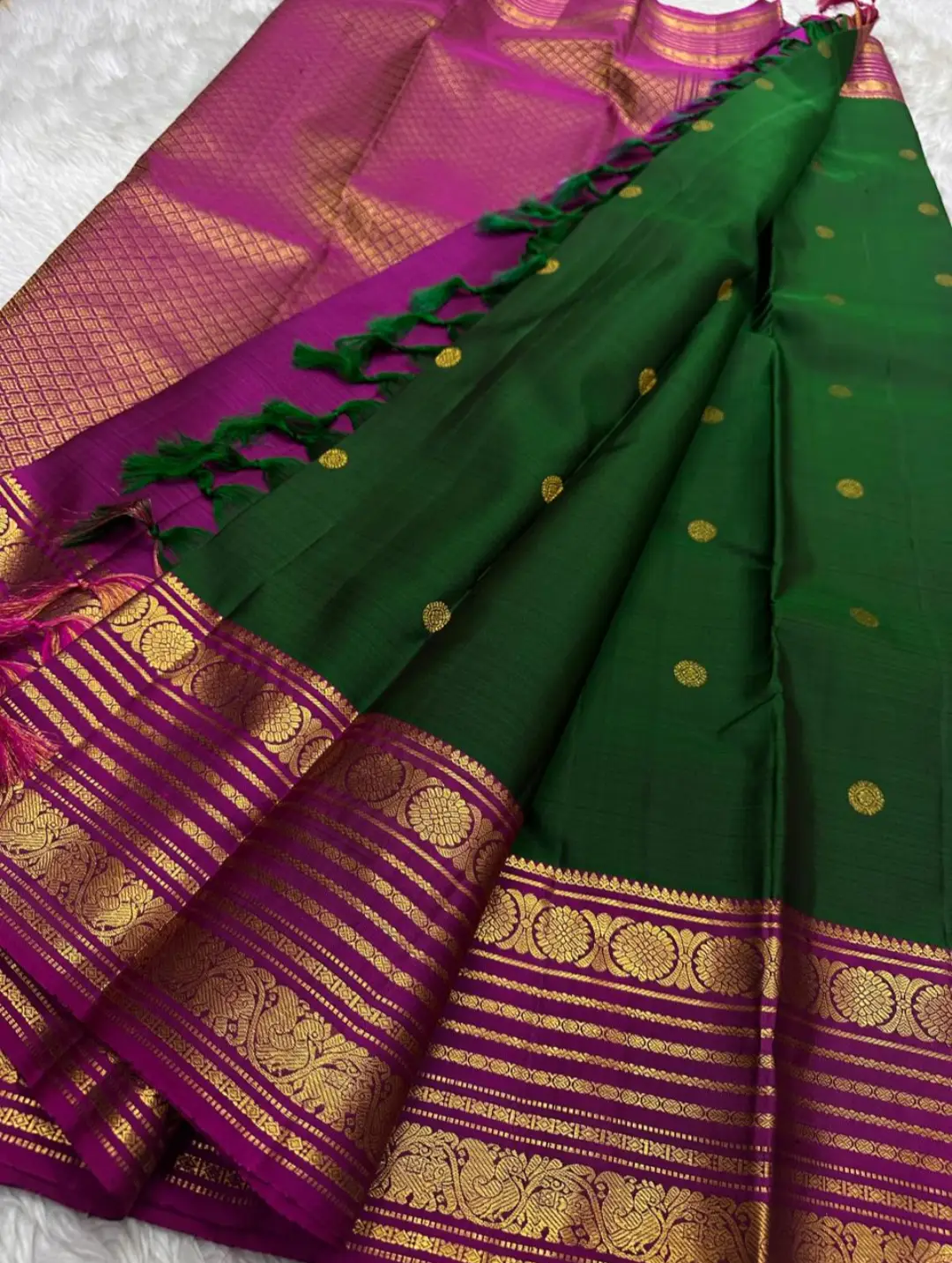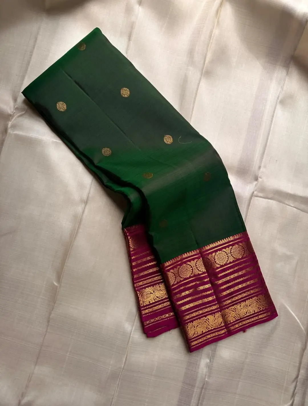A magnificent Emerald Green silk saree featuring large, evenly spaced Gold Zari Buttas on the body. It has a striking, extra-wide Rani Pink contrast border with intricate zari bands and a heavy, densely woven gold brocade pallu.