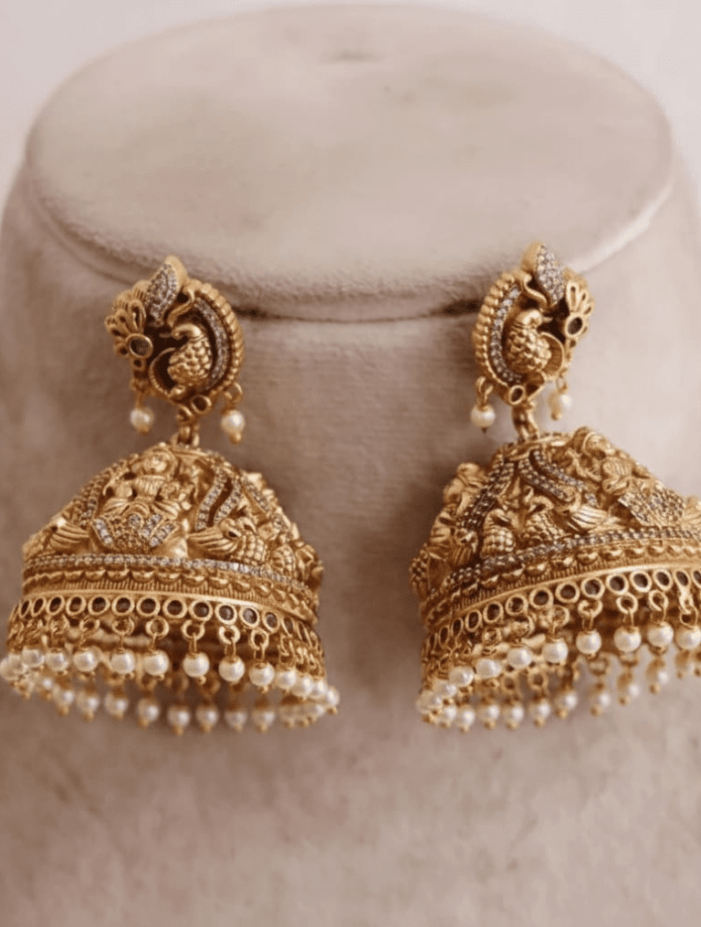 Grand antique gold jhumkas with intricate peacock and divine motifs, accented with stones and pearl drops.