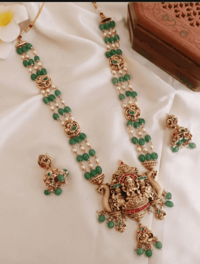 Design: A long, multi-layered necklace featuring two strands of green beads and pearls. The grand centerpiece is an antique gold pendant featuring the goddess Lakshmi seated upon two peacocks.