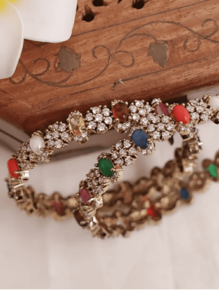 These colorful bangles feature vibrant stones and a sparkling design, perfect for any festive occasion.