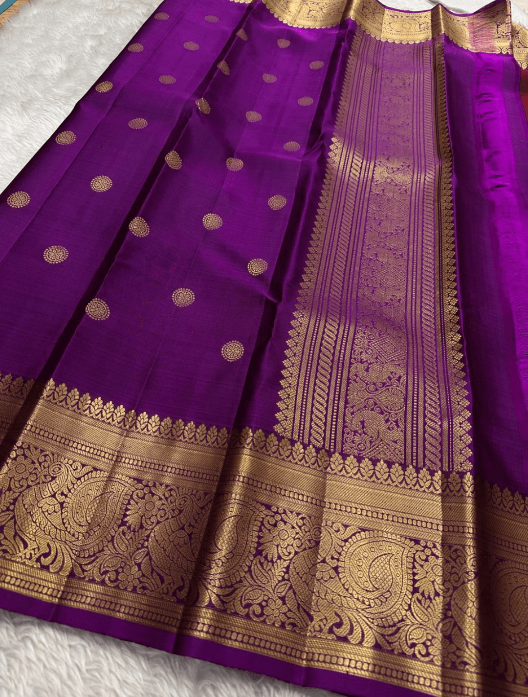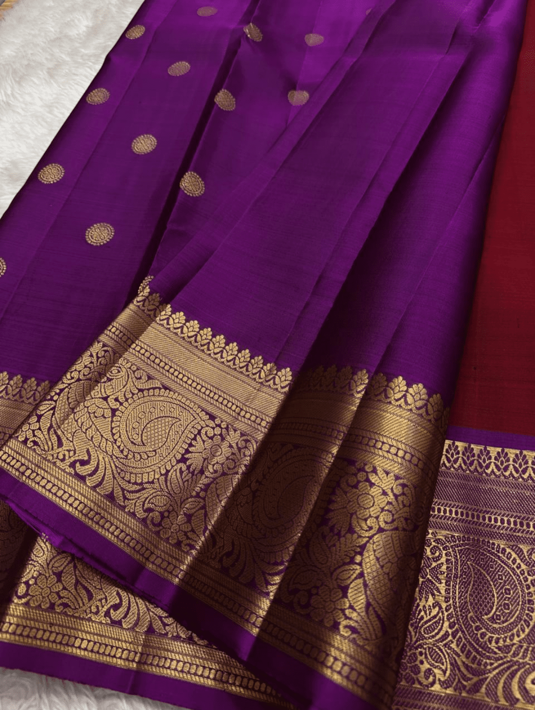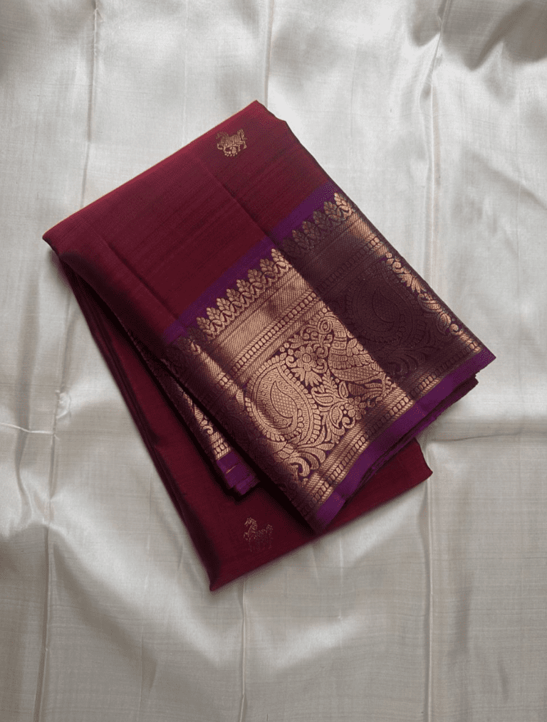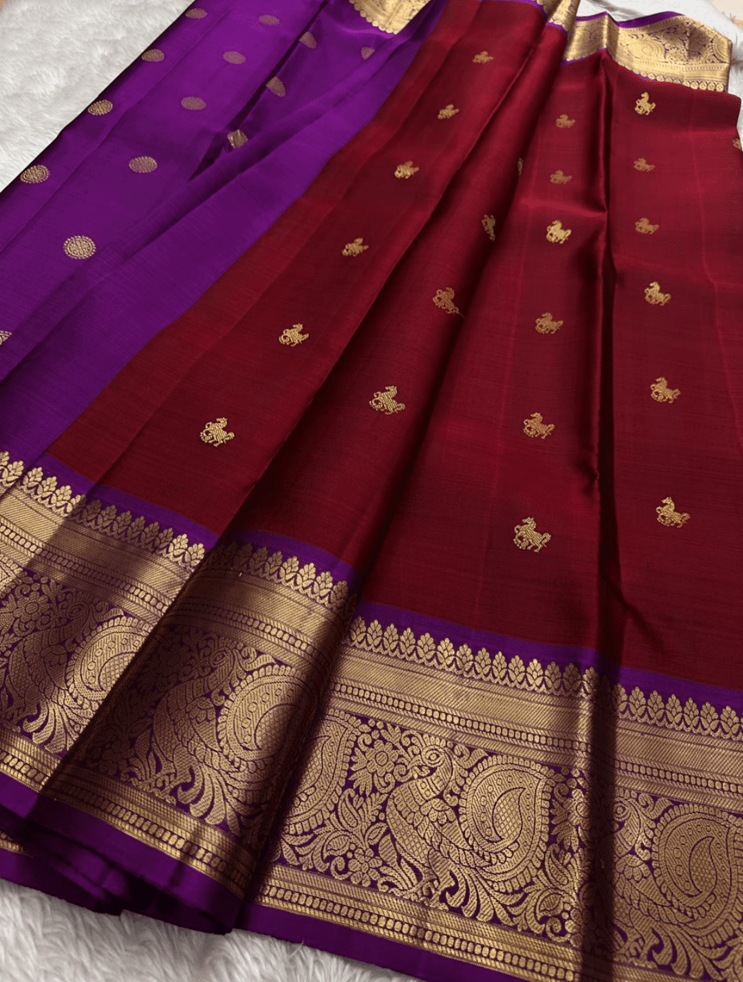 The Nayna saree, meaning ‘eyes,’ is a beautiful and soulful piece. Its deep maroon body with delicate golden buttas is a feast for the eyes. The contrasting purple border and pallu, adorned with intricate golden motifs, give this saree a truly captivating and graceful look.