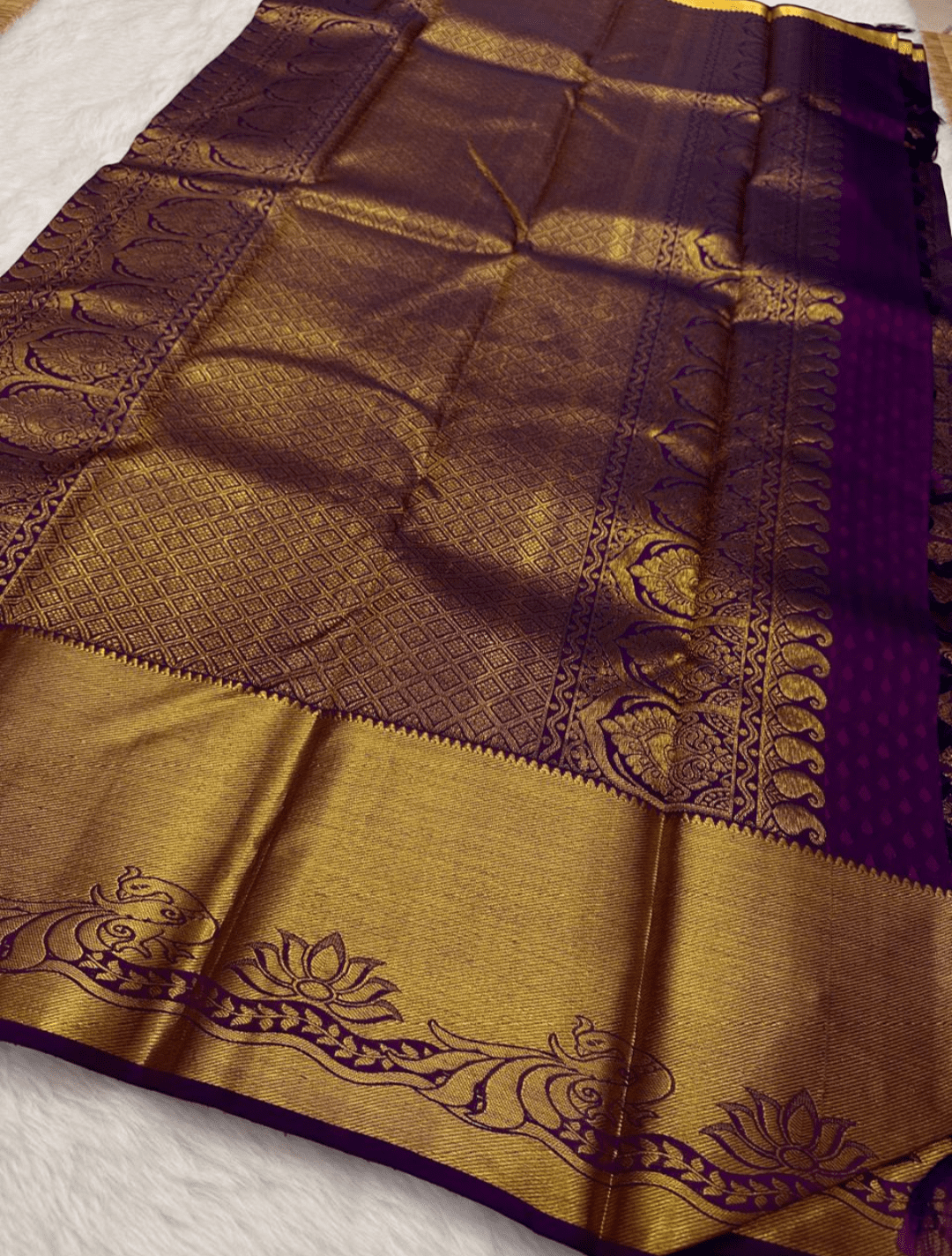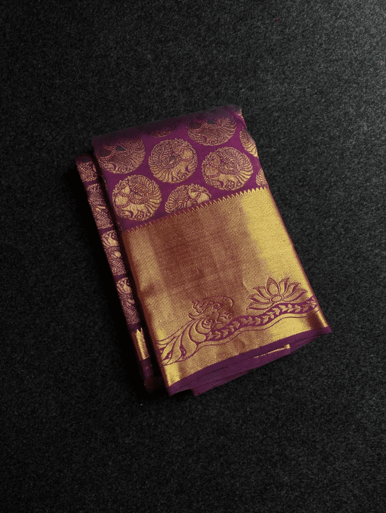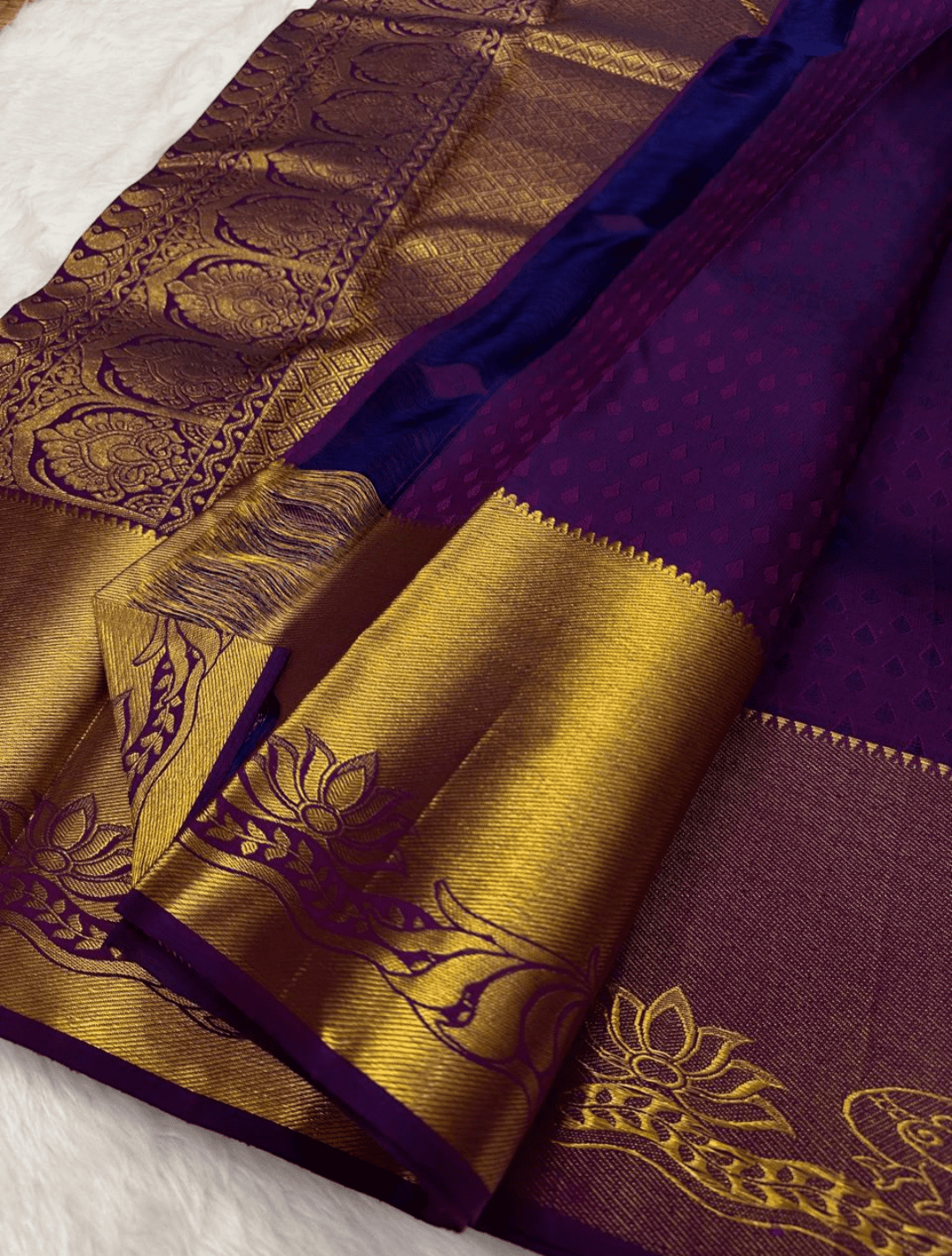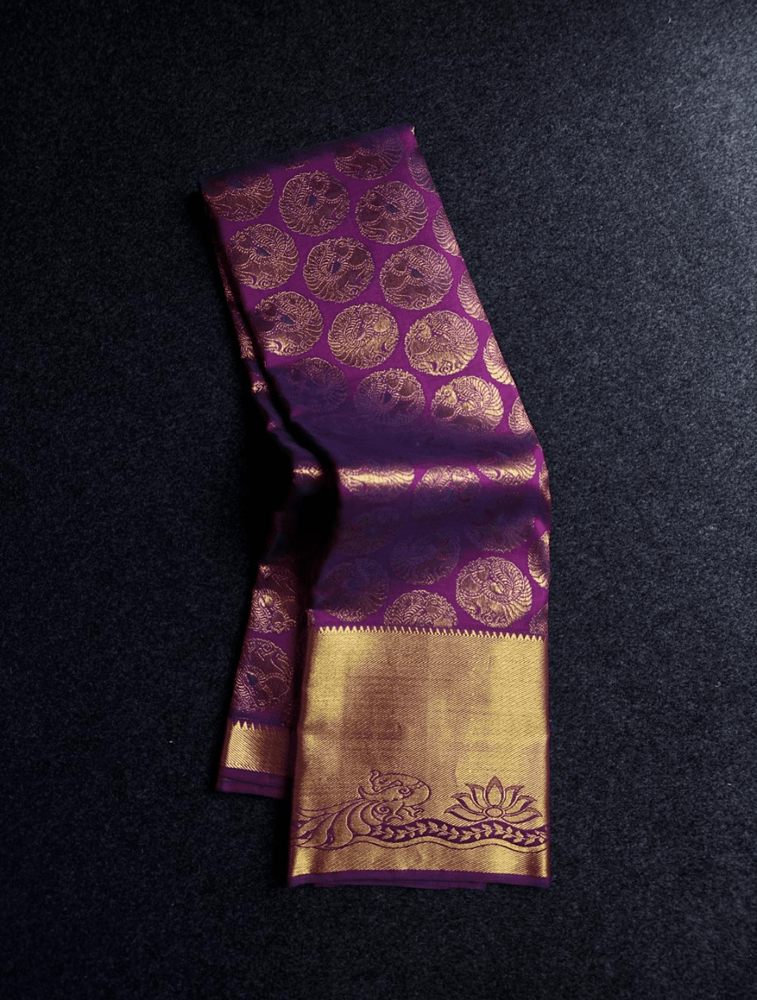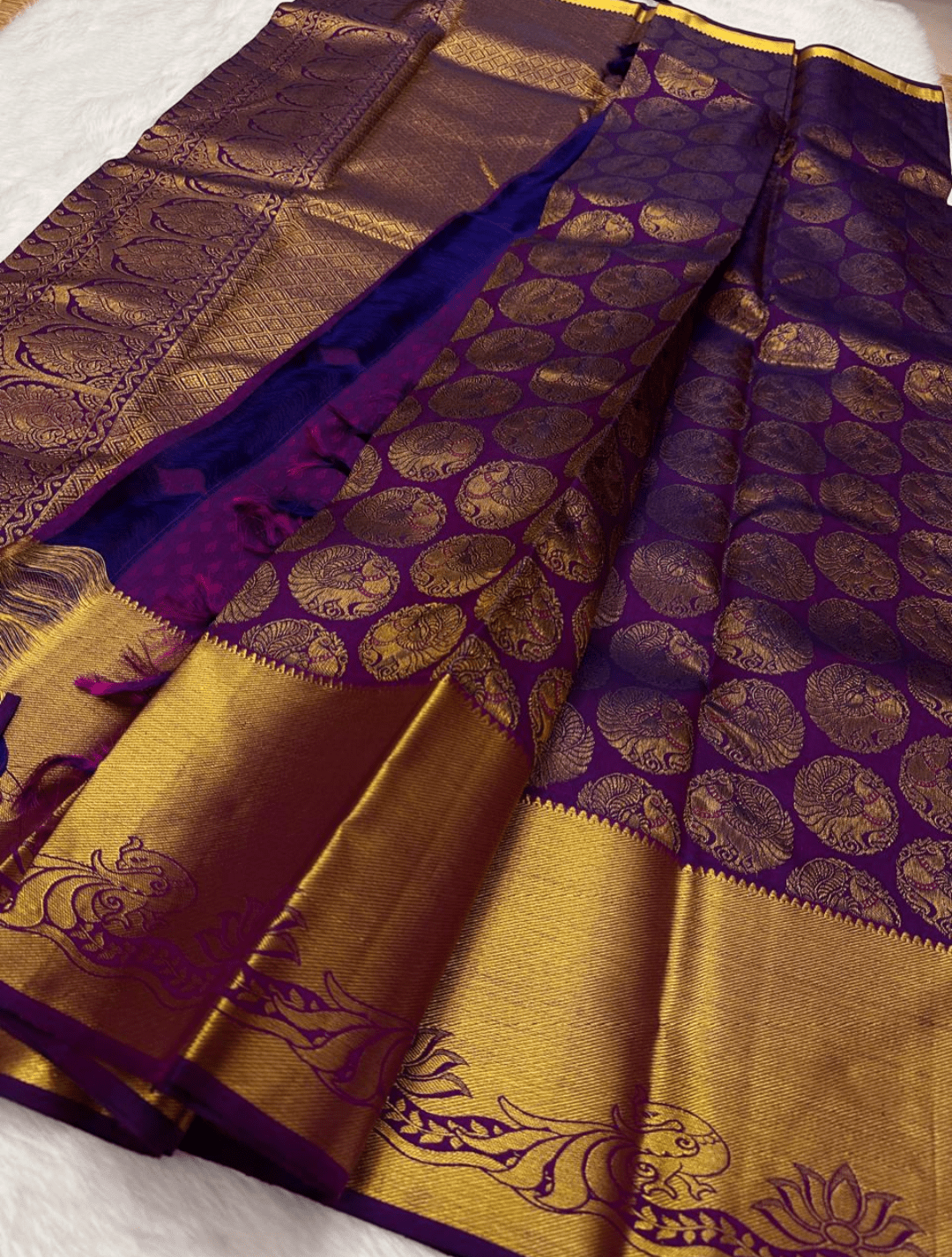 Deep Royal Purple/Violet silk with all-over large Gold Zari circular motifs (chakras/medallions).