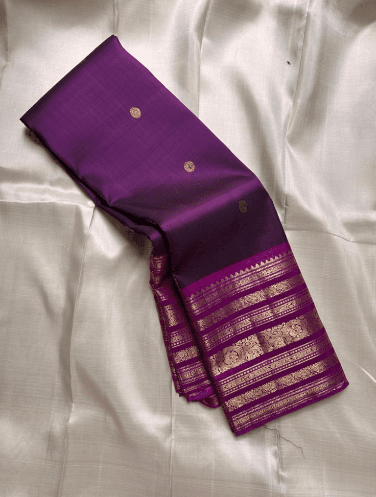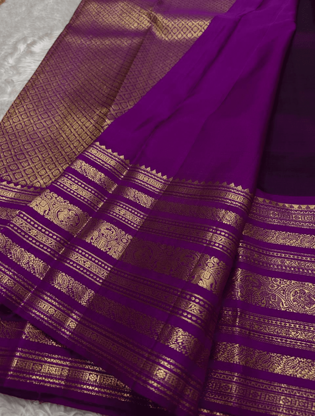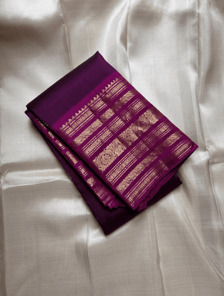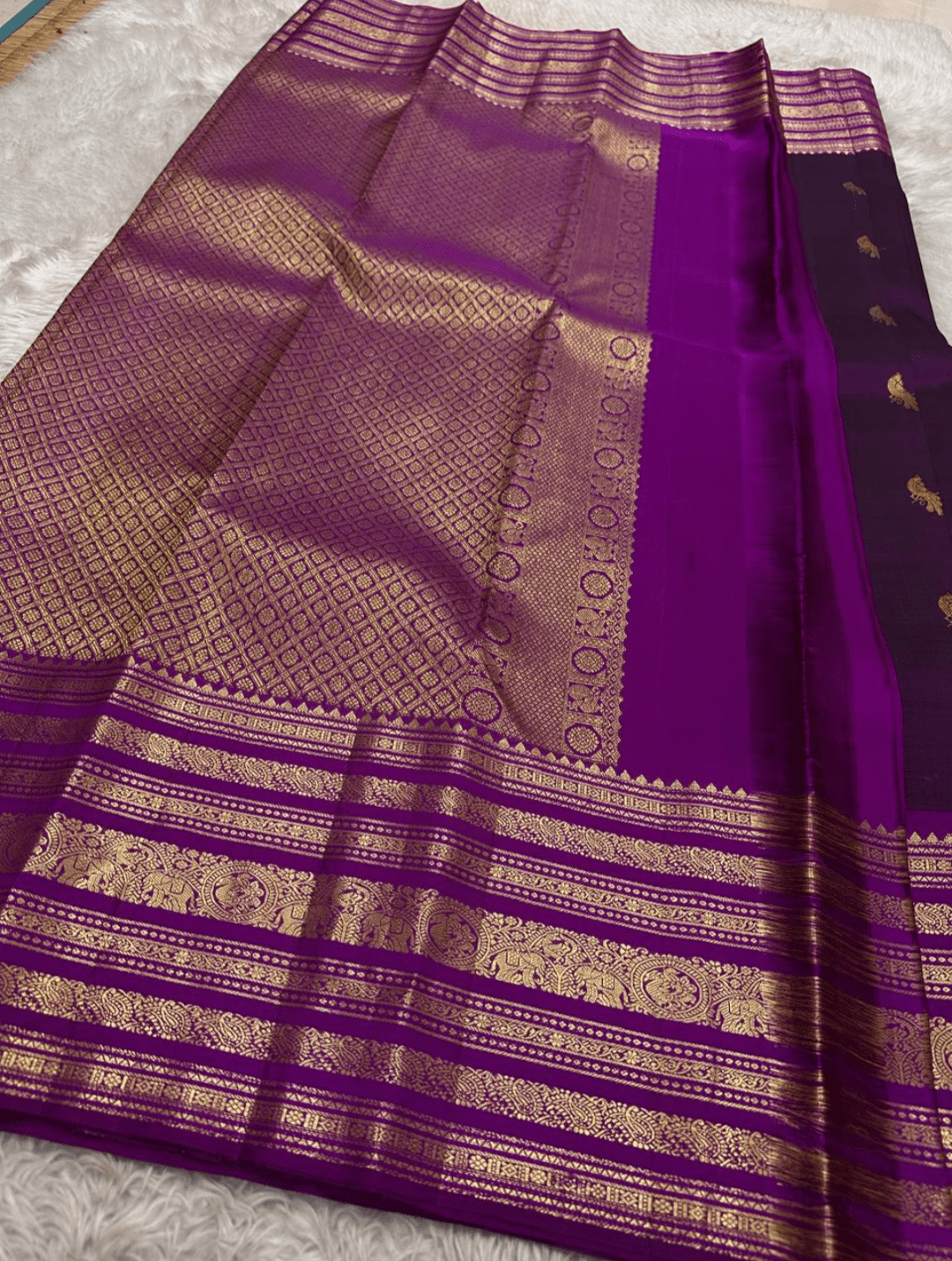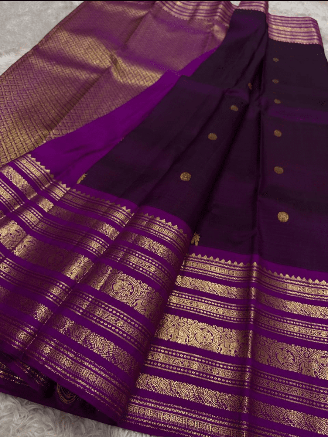 Color: A sophisticated aubergine body, paired with a vibrant purple border and shining gold zari. The contrasting shades create a striking and modern look.