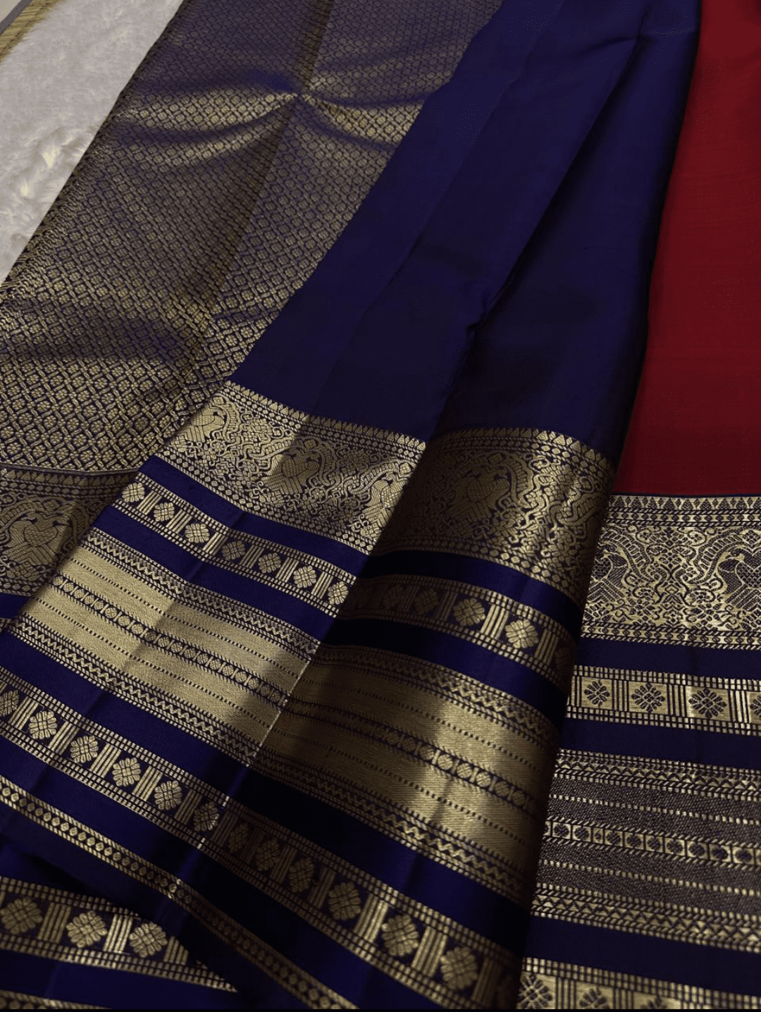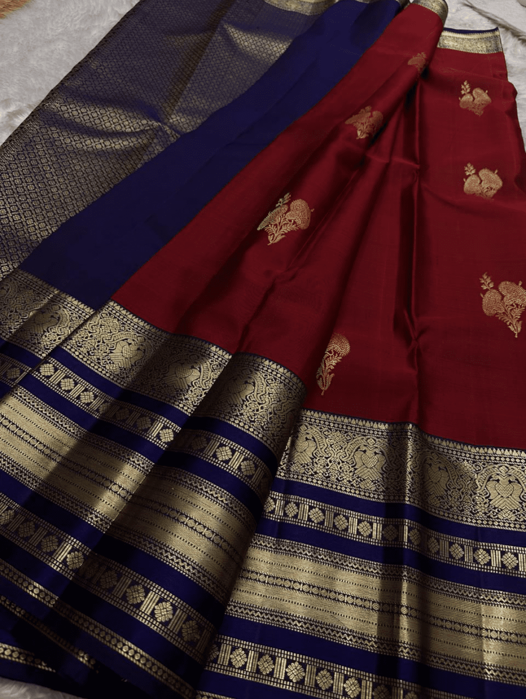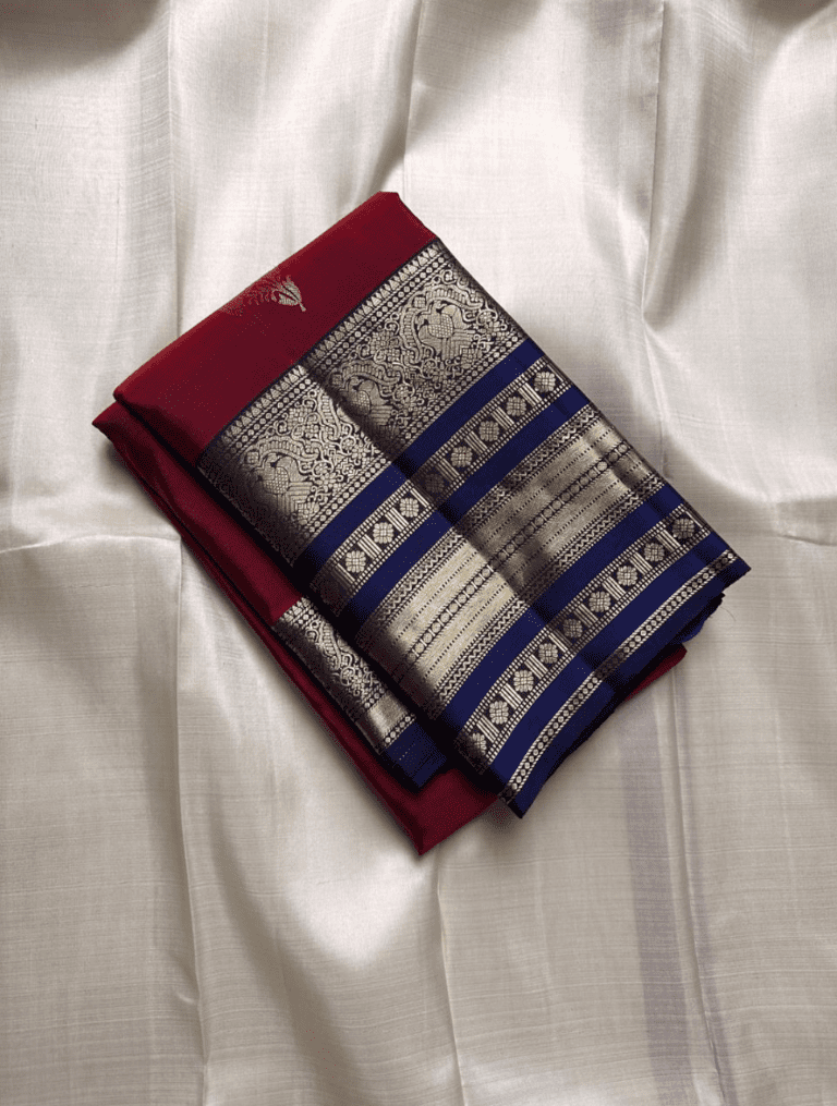 Color: A deep wine-red body with a solid royal blue border and pallu, complemented by radiant gold zari work.