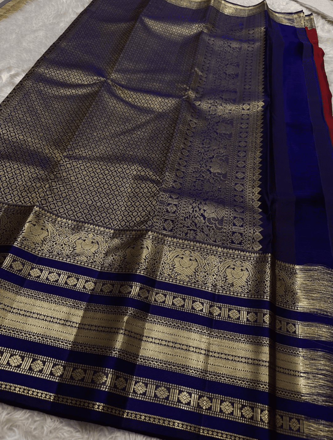 Border & Pallu: Golden Zari Weaving with Traditional Designs