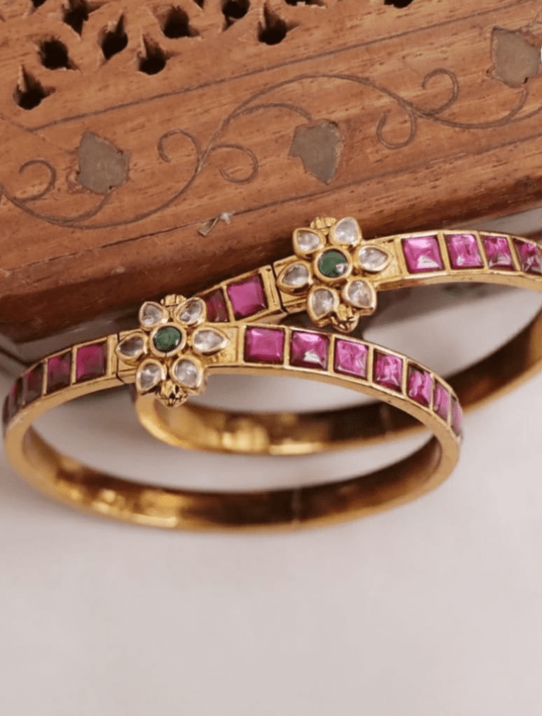 Design: Thin bangles with a square-cut stone border and a floral motif.