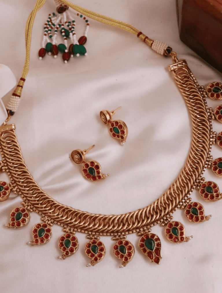 This stunning choker features a textured chain with gracefully hanging paisley-shaped pendants, adorned with red and green stones. The set comes with matching earrings.