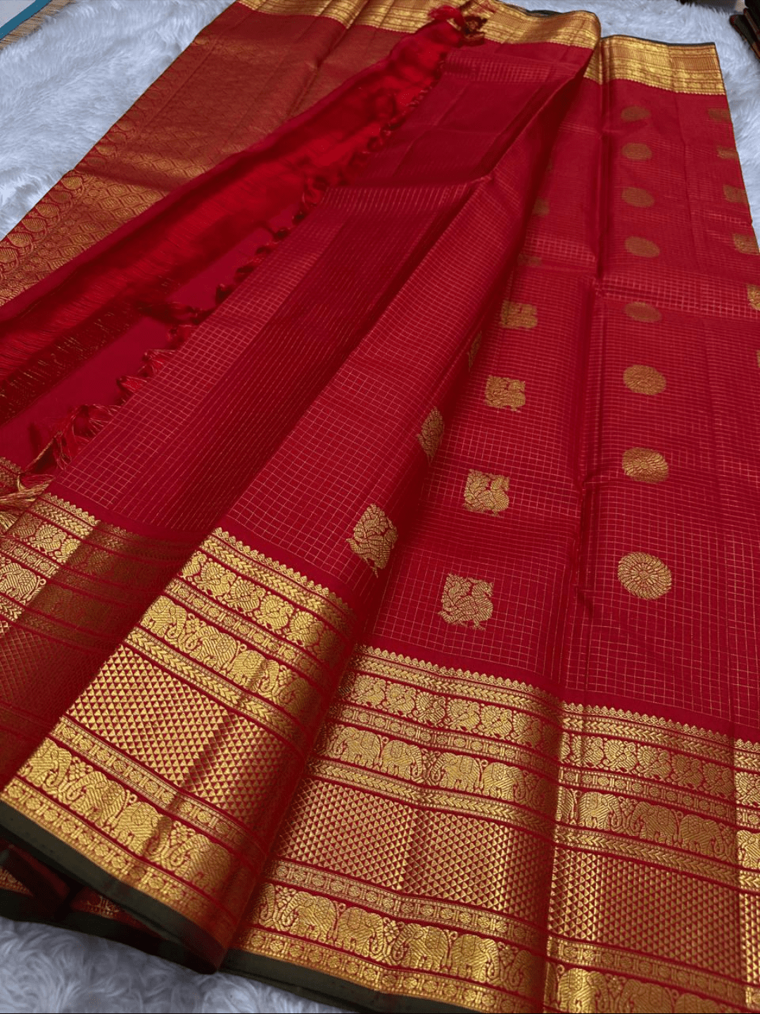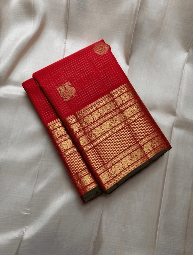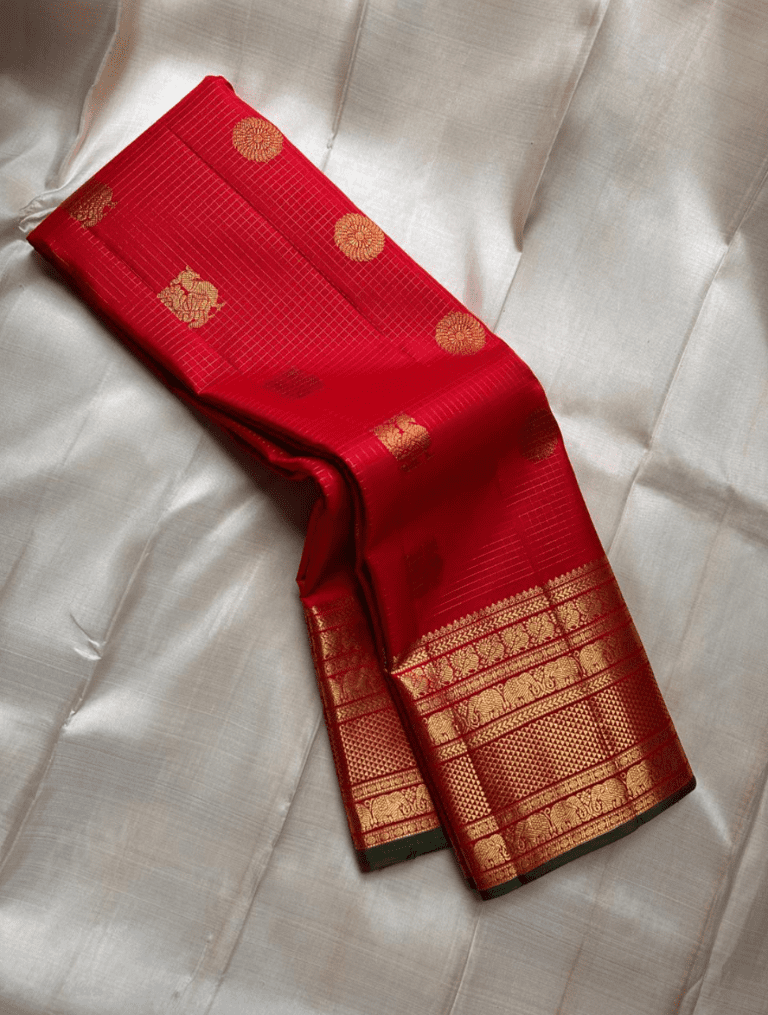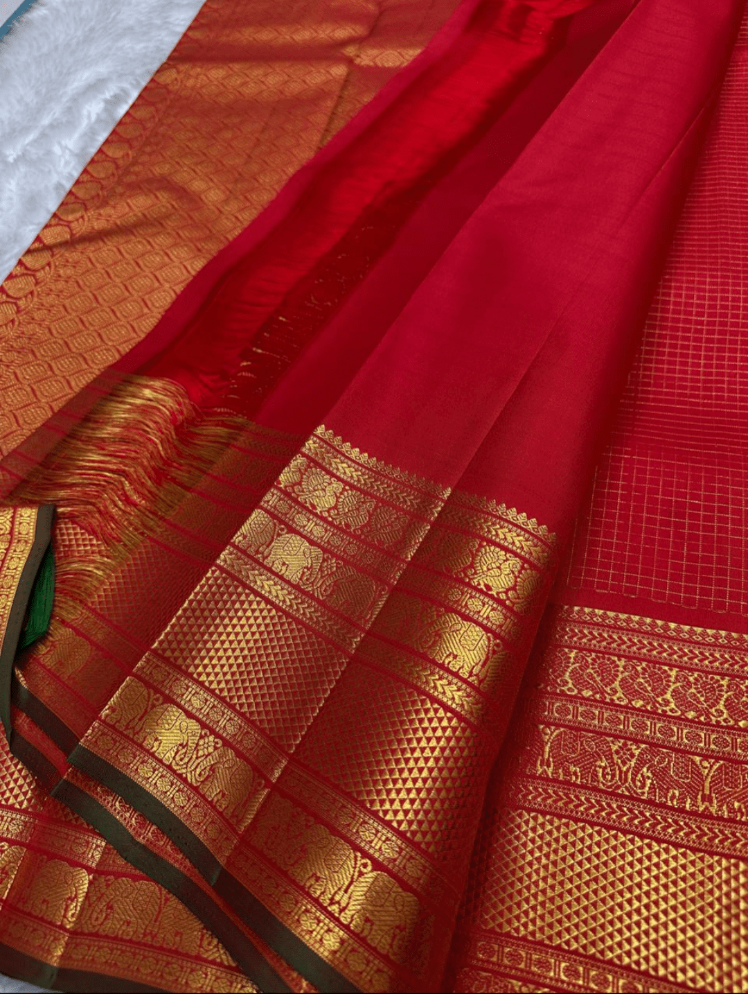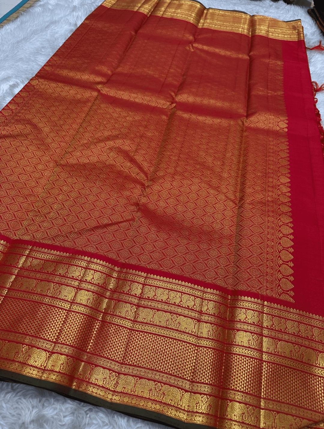 The Parnika saree, meaning ‘a small leaf,’ is a unique piece that blends earthy and vibrant tones. Its body in a beautiful olive-green is adorned with delicate golden buttas. The contrasting purple and gold border, with its traditional motifs, adds a touch of classic charm, while the striking purple pallu provides a rich finish.