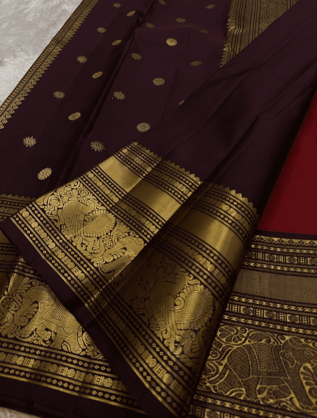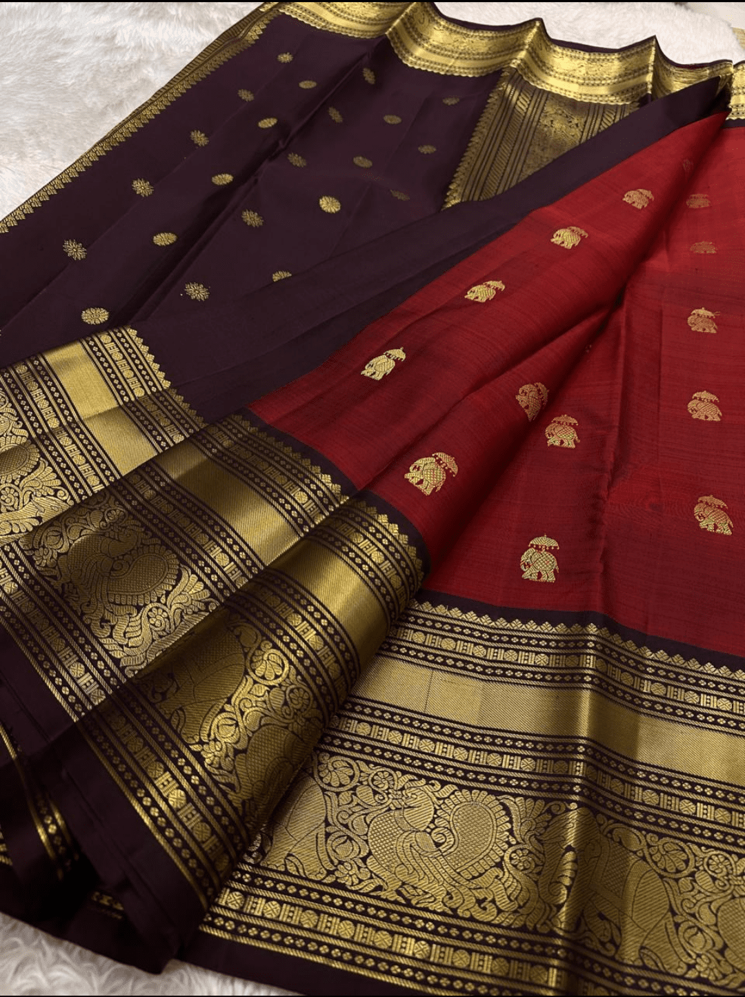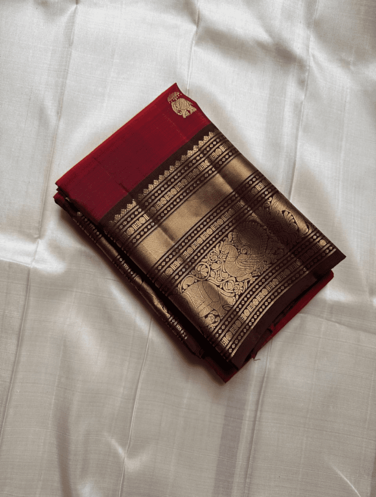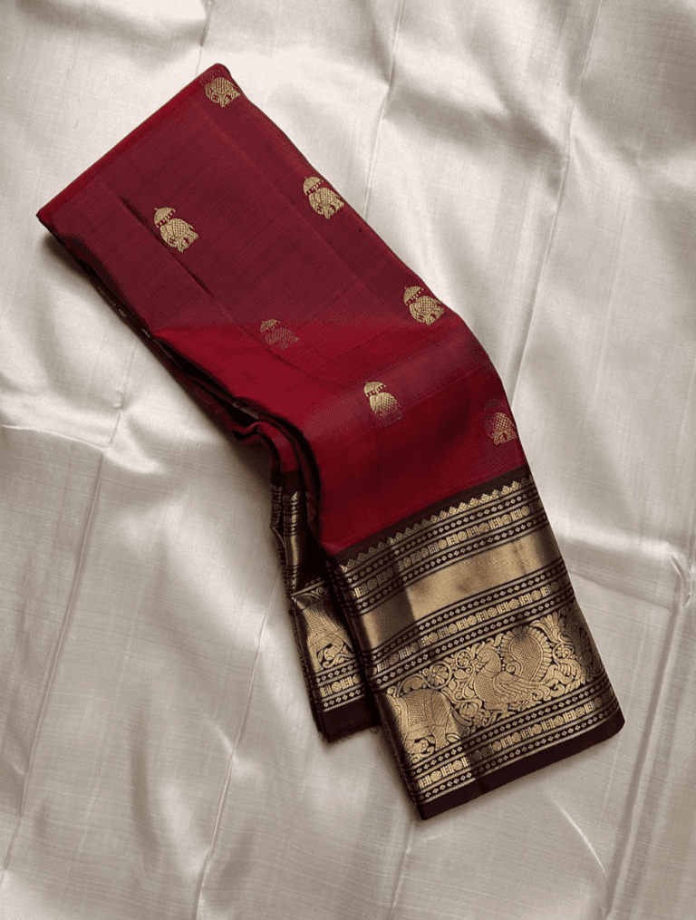 Rajasi is a majestic saree that exudes a truly royal presence, fit for a queen. The body is a deep, passionate red, adorned with small, intricate golden motifs that are reminiscent of royal emblems. This striking red is beautifully complemented by a rich, deep maroon pallu and border, both woven with magnificent golden zari work. The traditional motifs on the border, including peacocks and stylized elephants, add a touch of timeless grandeur and elegance, making it a masterpiece of classic design.
