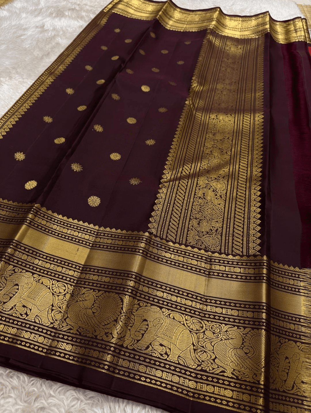 Design: The saree has small, beautiful golden motifs scattered across the body. The broad borders are masterfully woven with intricate traditional patterns, including peacocks and elephants, in lustrous gold zari.