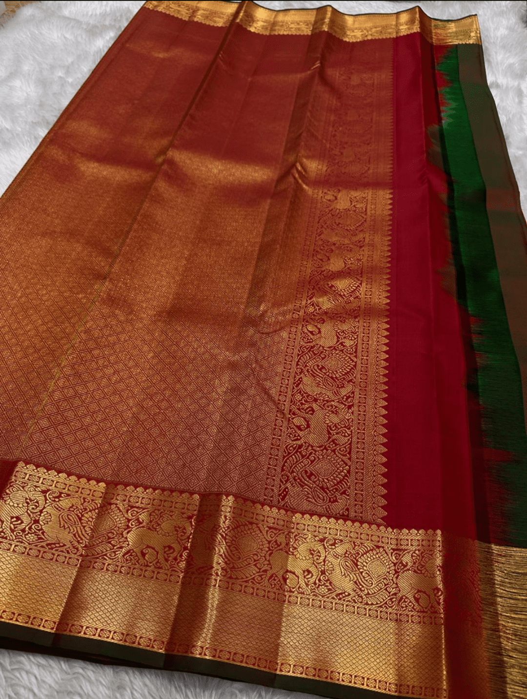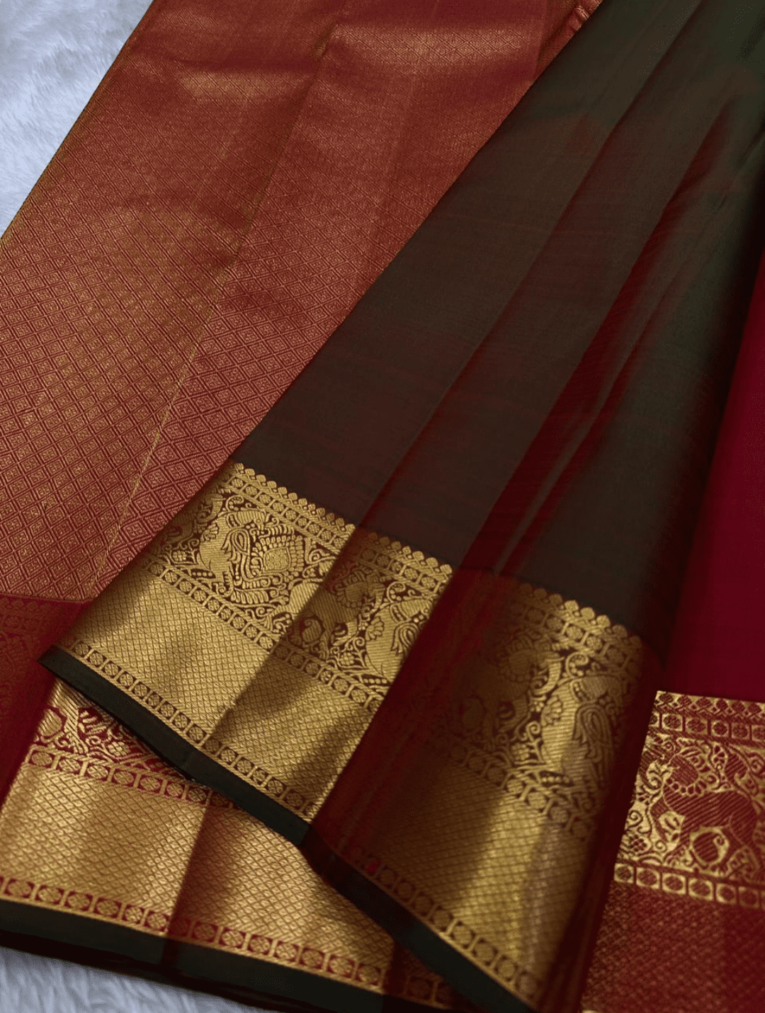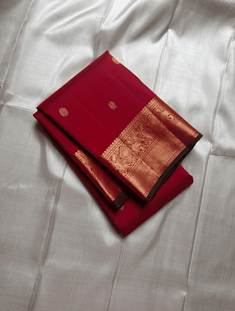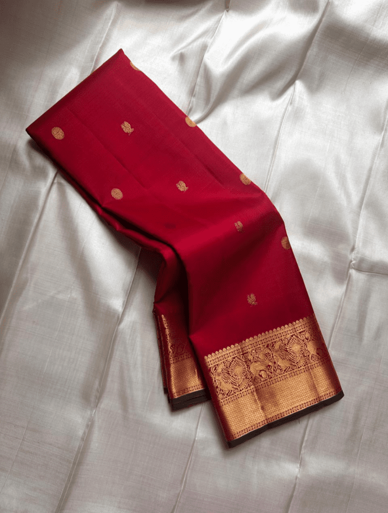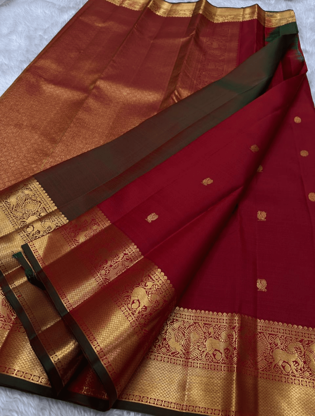 The ‘Raktambara’ saree, meaning ‘red attire,’ is a timeless piece that exudes grace and power. Its deep crimson body, adorned with subtle golden buttas, is beautifully contrasted by a forest green and gold pallu. The intricate gold zari border, featuring classic peacock and floral motifs, adds a majestic and traditional touch. Peacock designs are considered auspicious and symbolize beauty and grace.