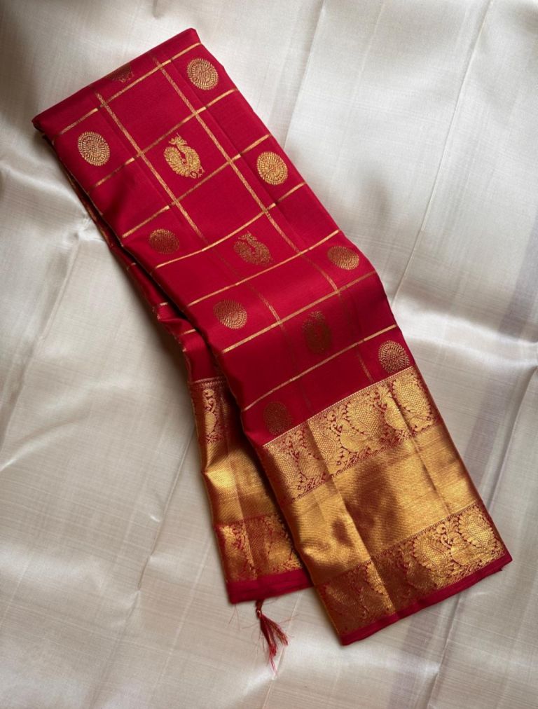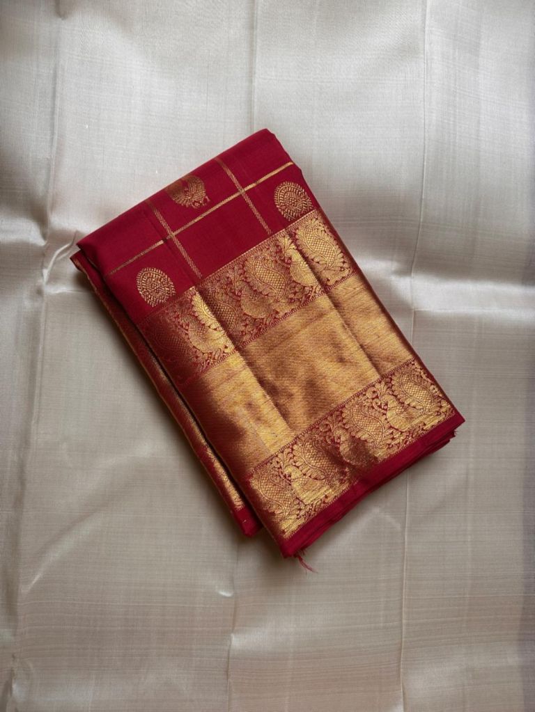 Ranjana – The Adorned Elegance ❤️✨ “Ranjana,” meaning one who brings joy and adorns beauty, perfectly reflects the charm of this saree. The deep crimson red body is enhanced with subtle gold checks and motifs, while the broad golden zari border showcases intricate peacock and floral designs that exude grandeur. The richly woven golden pallu makes it an exquisite statement of tradition and artistry.
