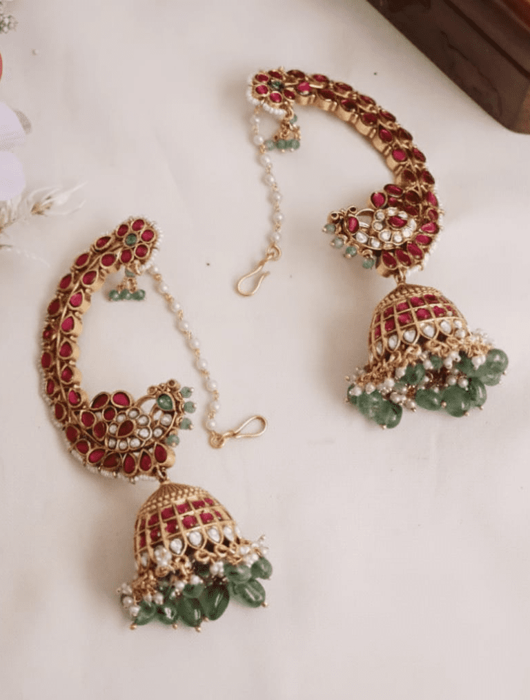 These elegant earrings feature a ruby-studded dome with a floral ear cuff and delicate pearl drops.