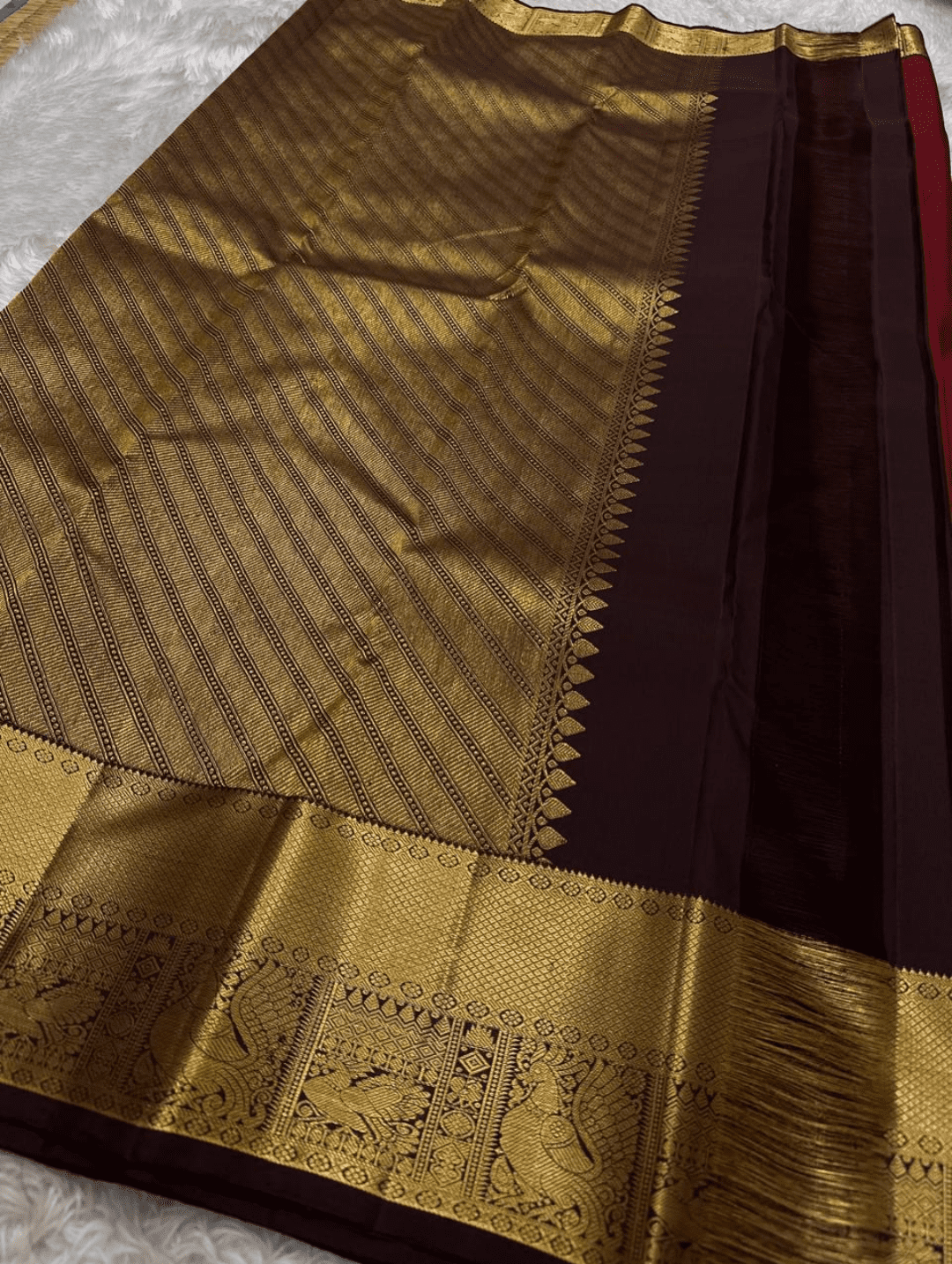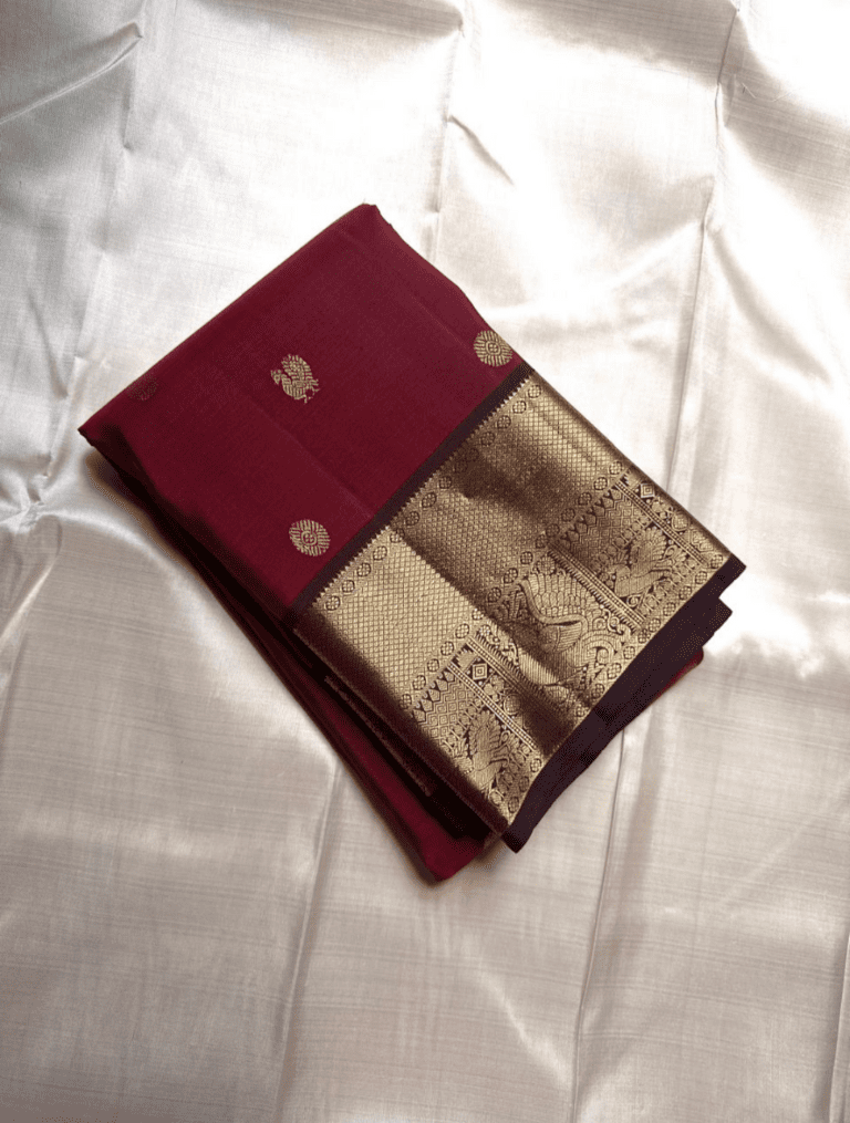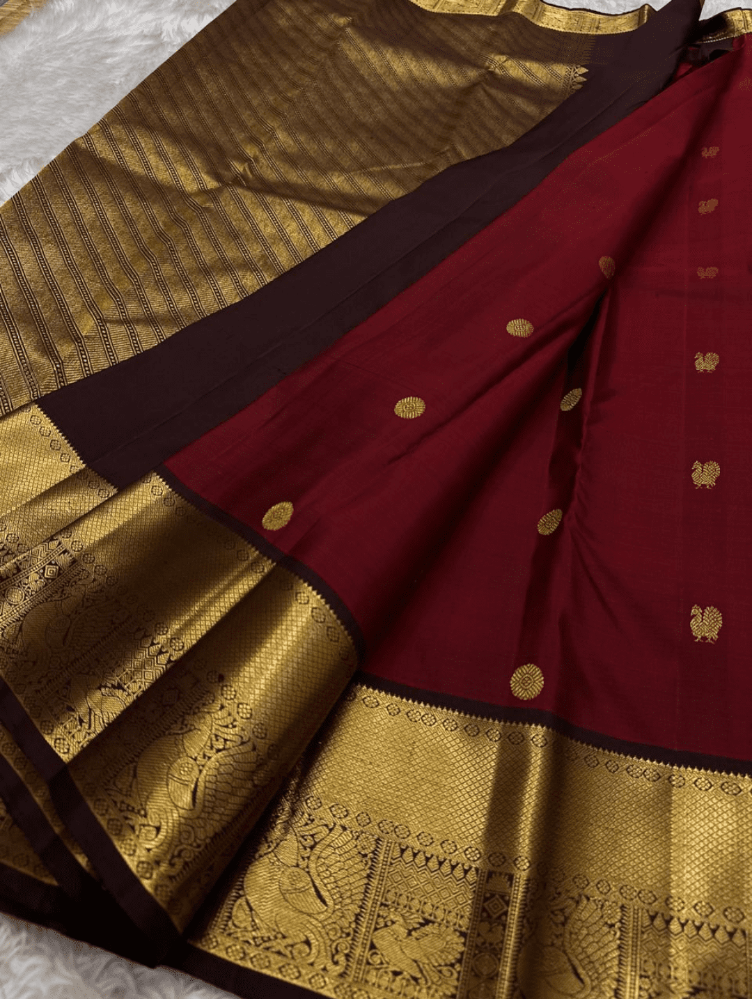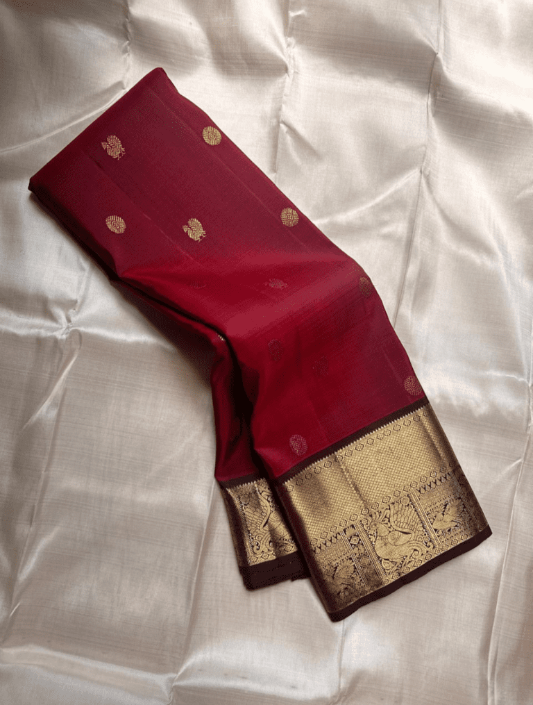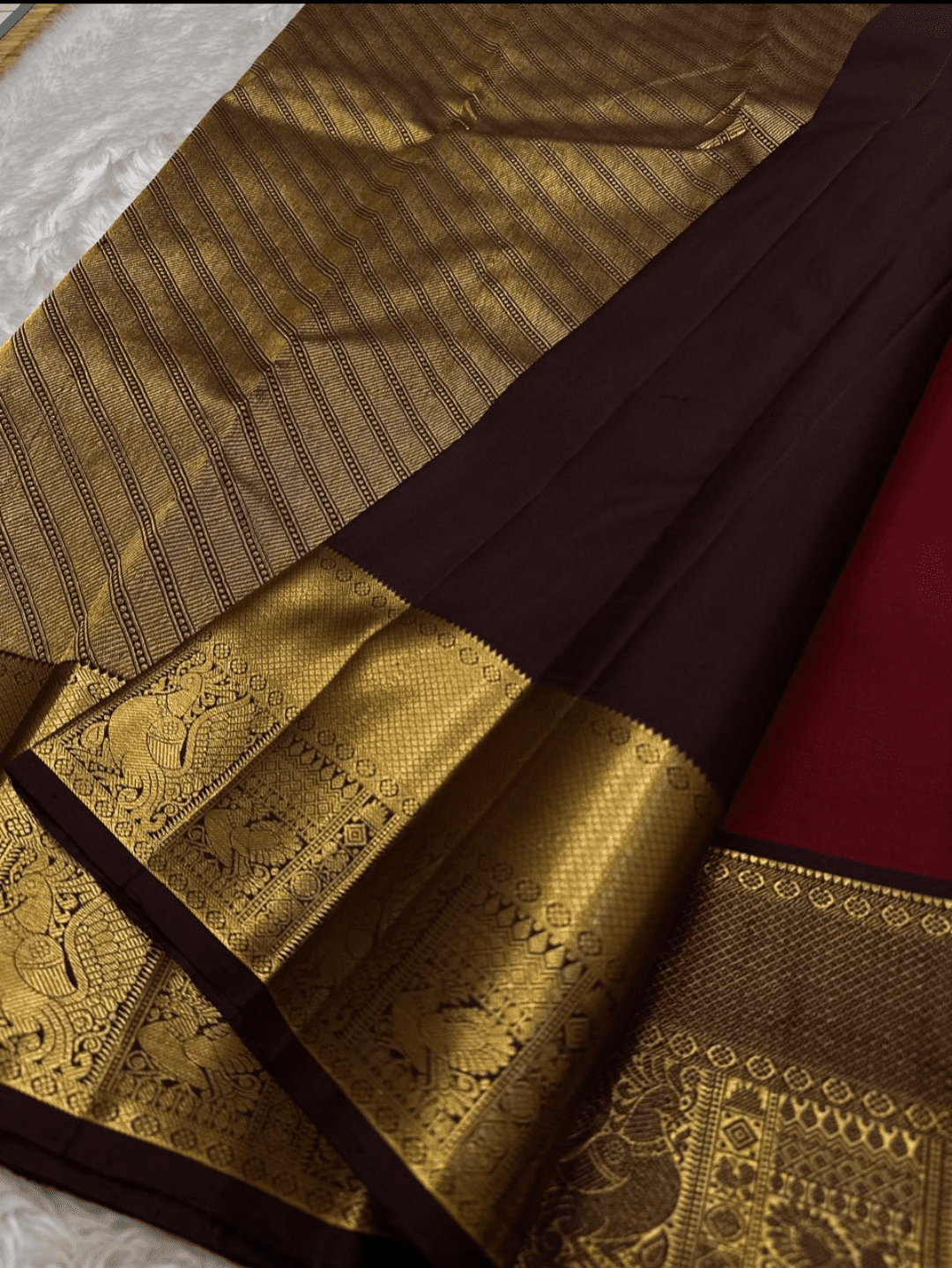Rudhira is a captivating saree that exudes traditional elegance. The body is a rich crimson red, adorned with delicate golden dot and peacock motifs. It features a wide, contrasting black border with intricate golden zari work, and a deep maroon pallu with stripes, creating a truly charming and luxurious look.