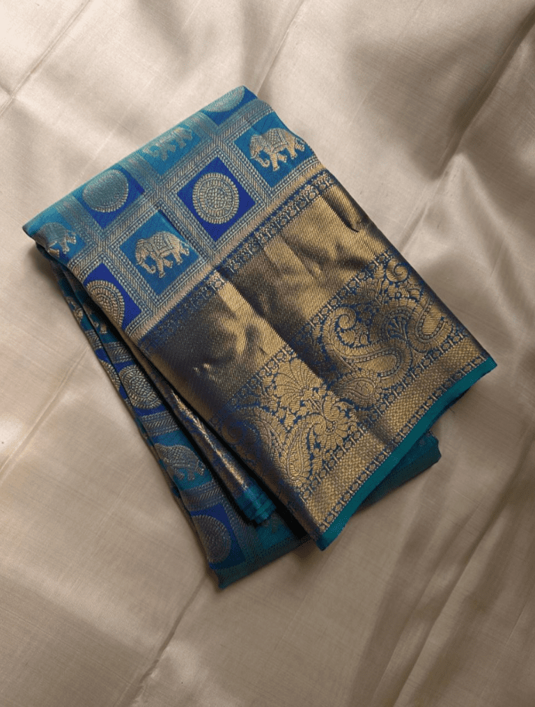 The ‘Samudra’ saree, or ‘ocean,’ beautifully represents the serene yet powerful essence of the sea. Its deep blue and turquoise hues flow together like waves, while the golden zari border, with its intricate motifs, adds a sense of timeless richness. This saree is a celebration of both nature’s beauty and traditional craftsmanship.