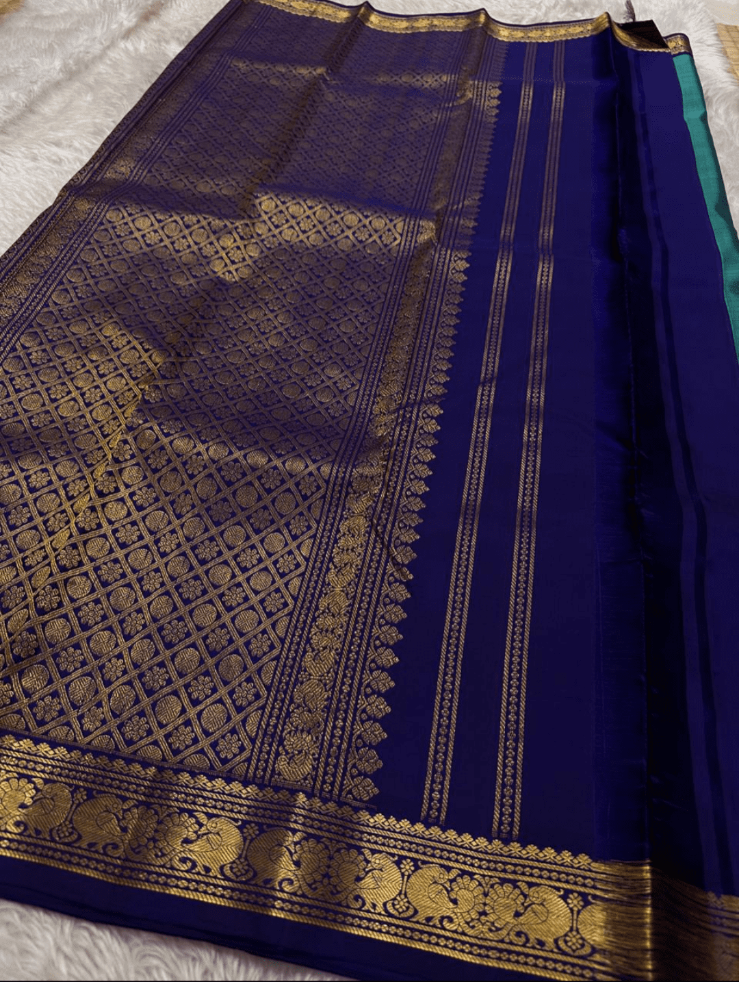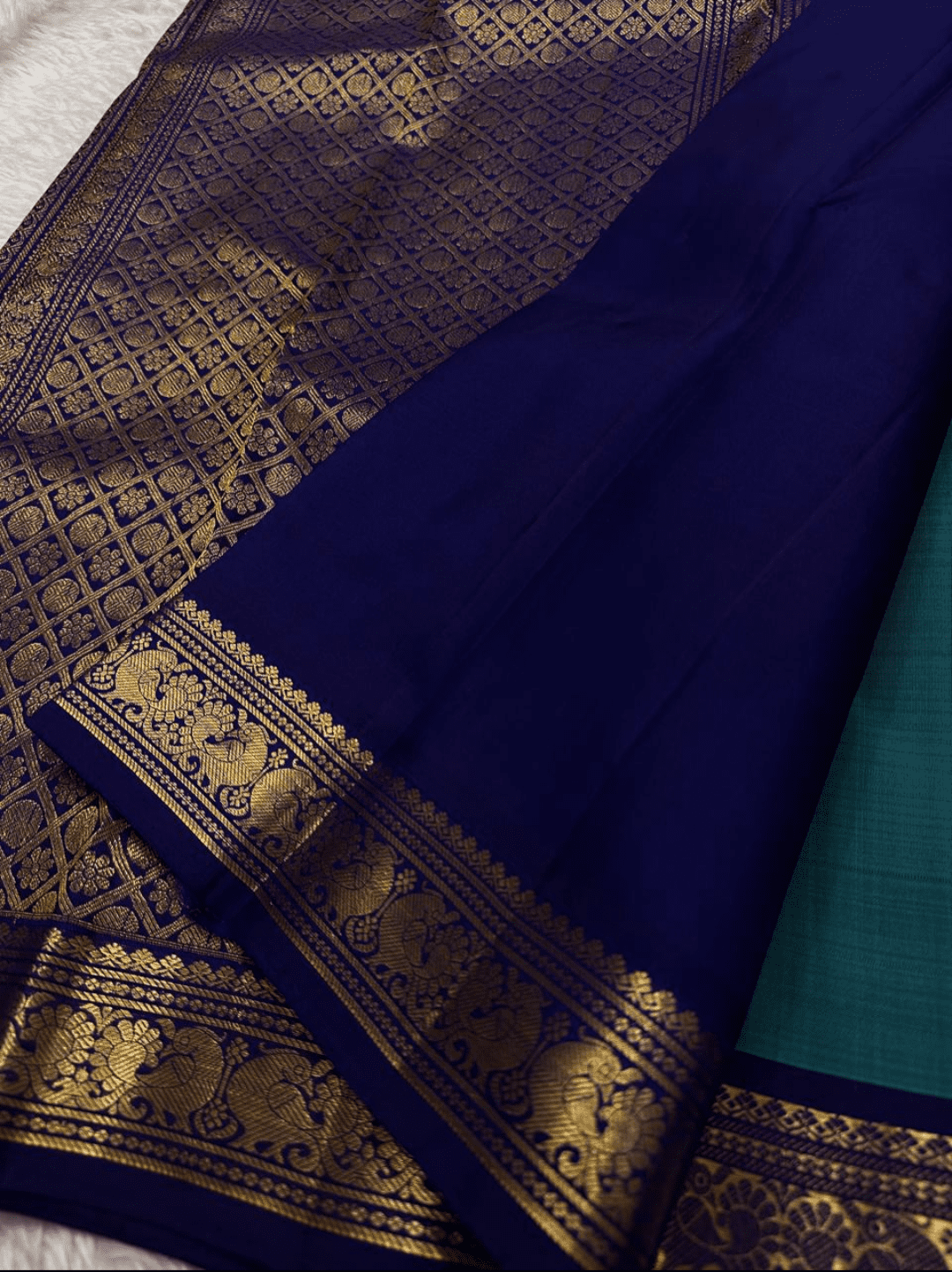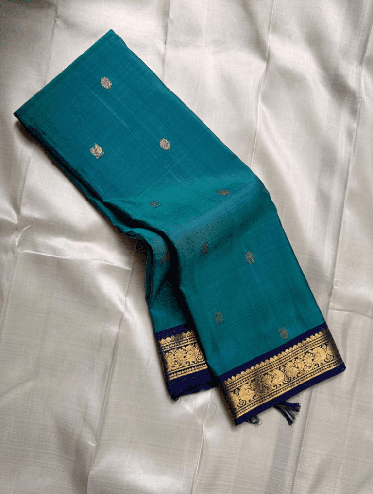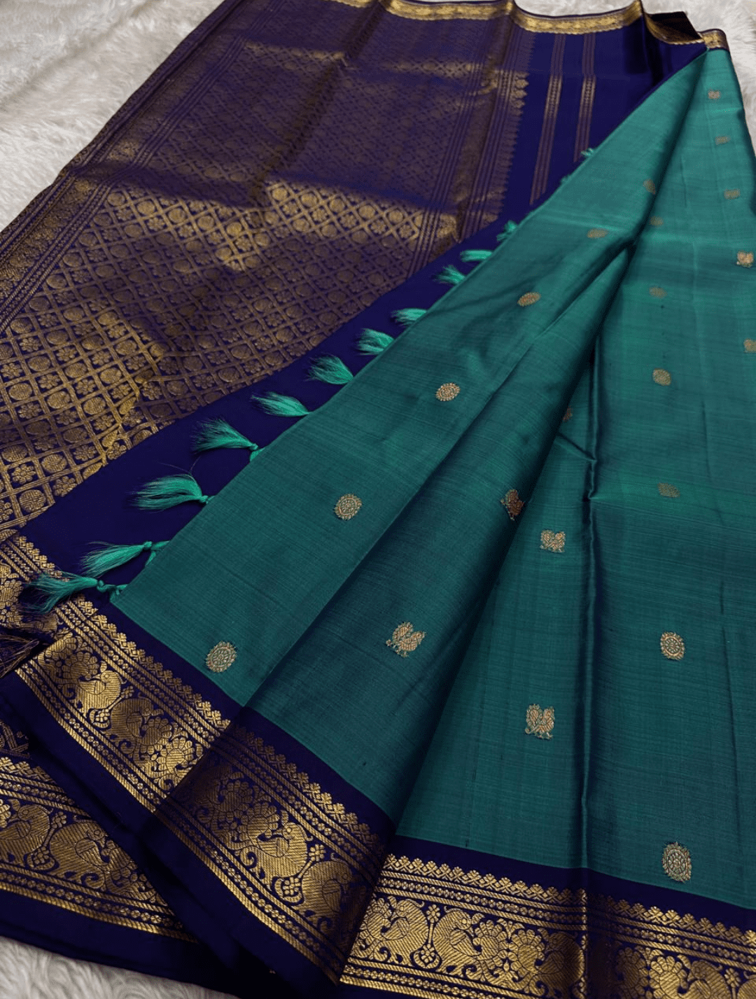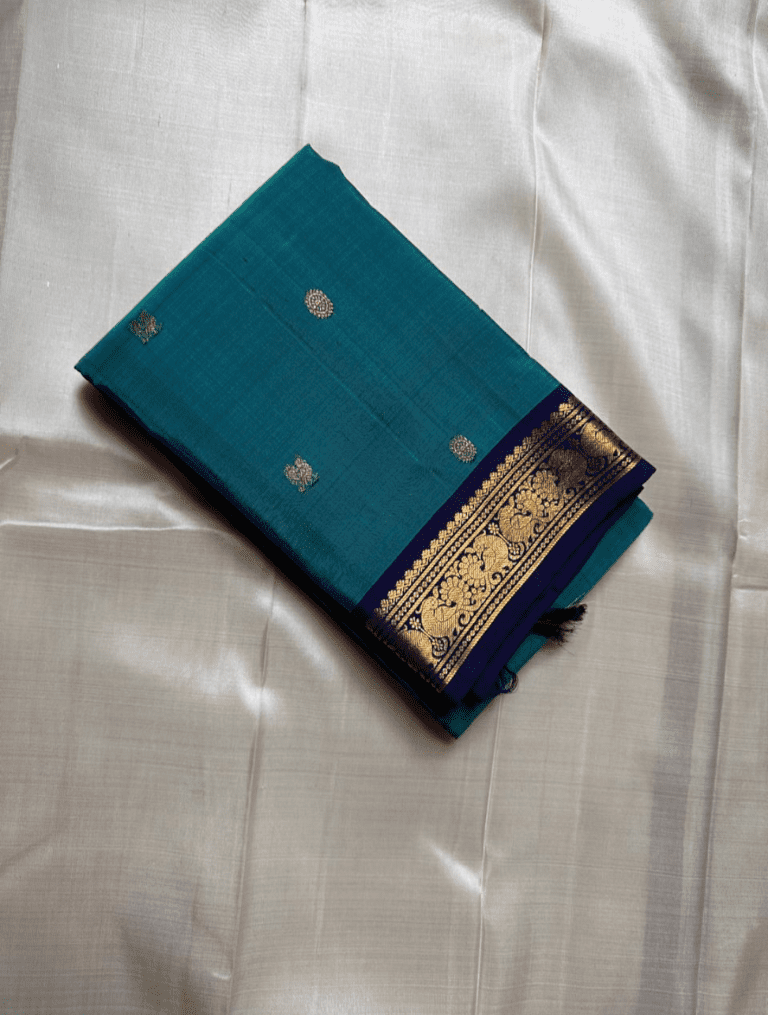 Color: A tranquil teal body with a deep navy blue border and pallu, richly embellished with golden zari.
