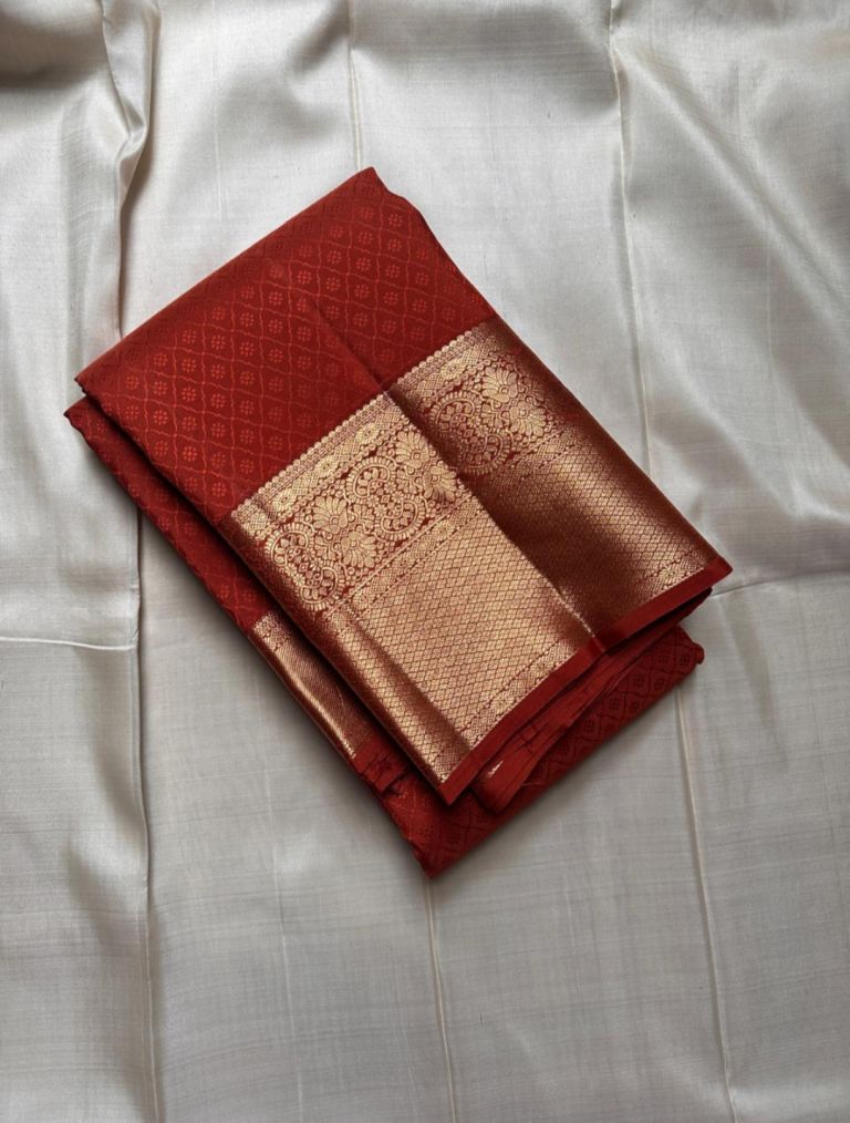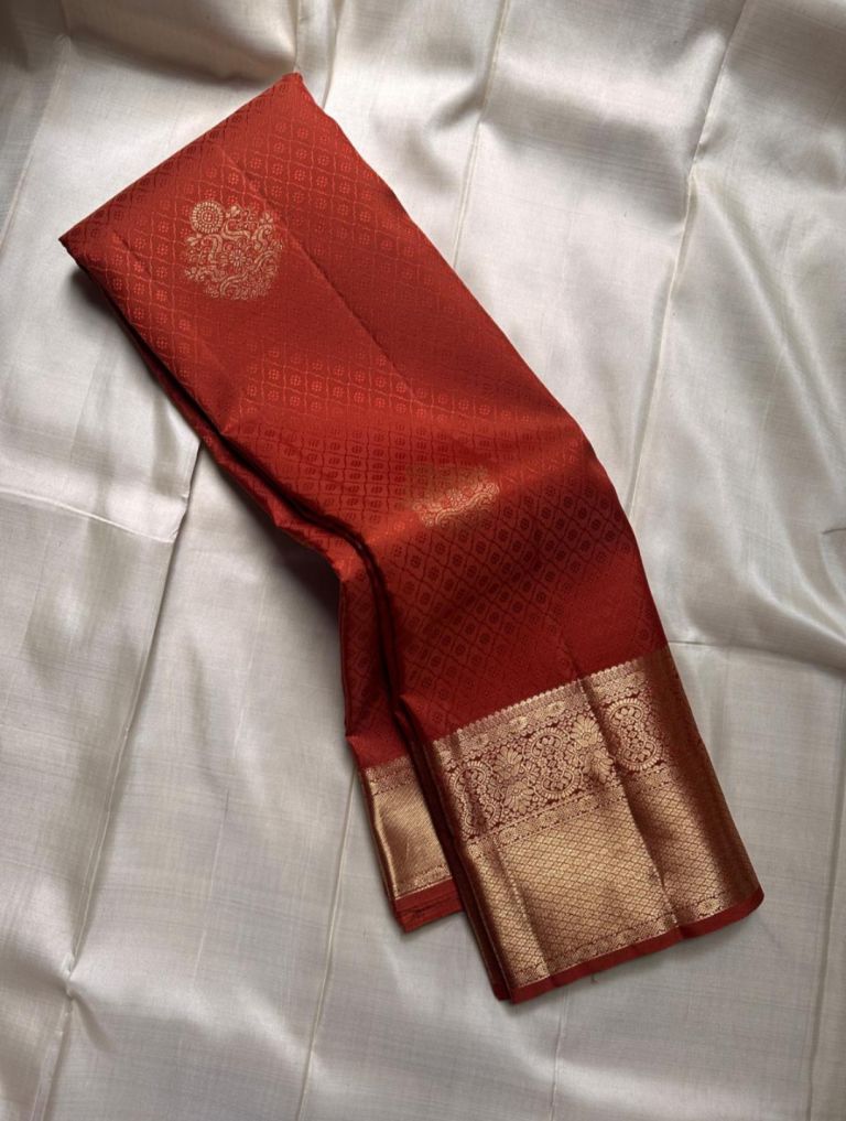 “Sharini” – means Earth, one who is enduring and graceful. A majestic rust-red Kanjivaram saree, Sharini carries an aura of timeless grace. The body is adorned with delicate self-jacquard patterns, giving it a rich textured look. Its wide antique gold zari border and pallu showcase intricate floral and geometric designs, radiating opulence and tradition.