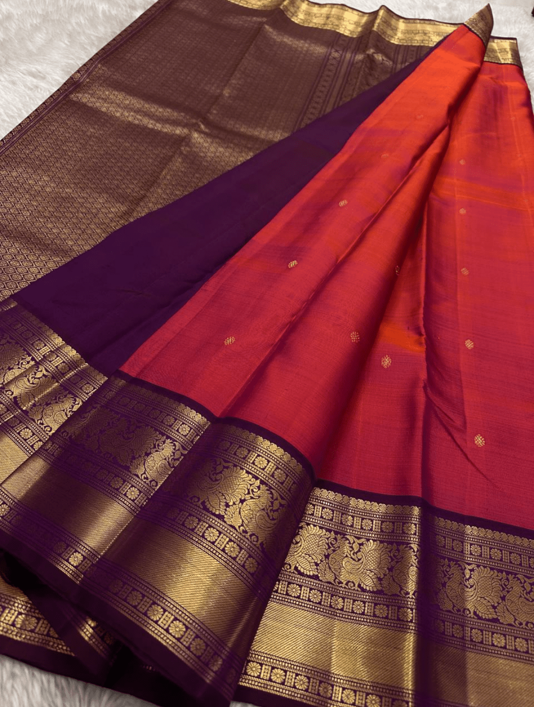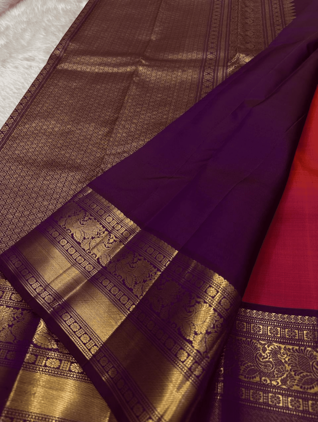Color: A peach-pink body with a contrasting dark purple pallu and a wide golden border.
