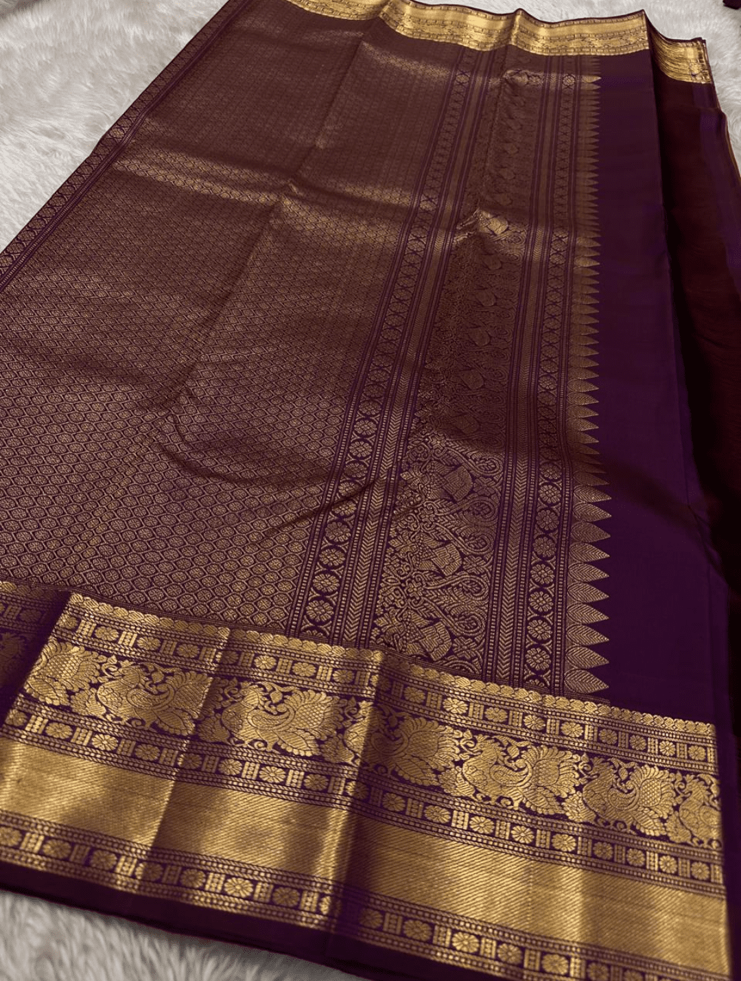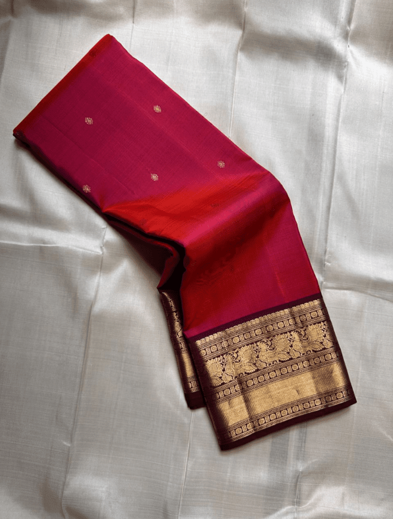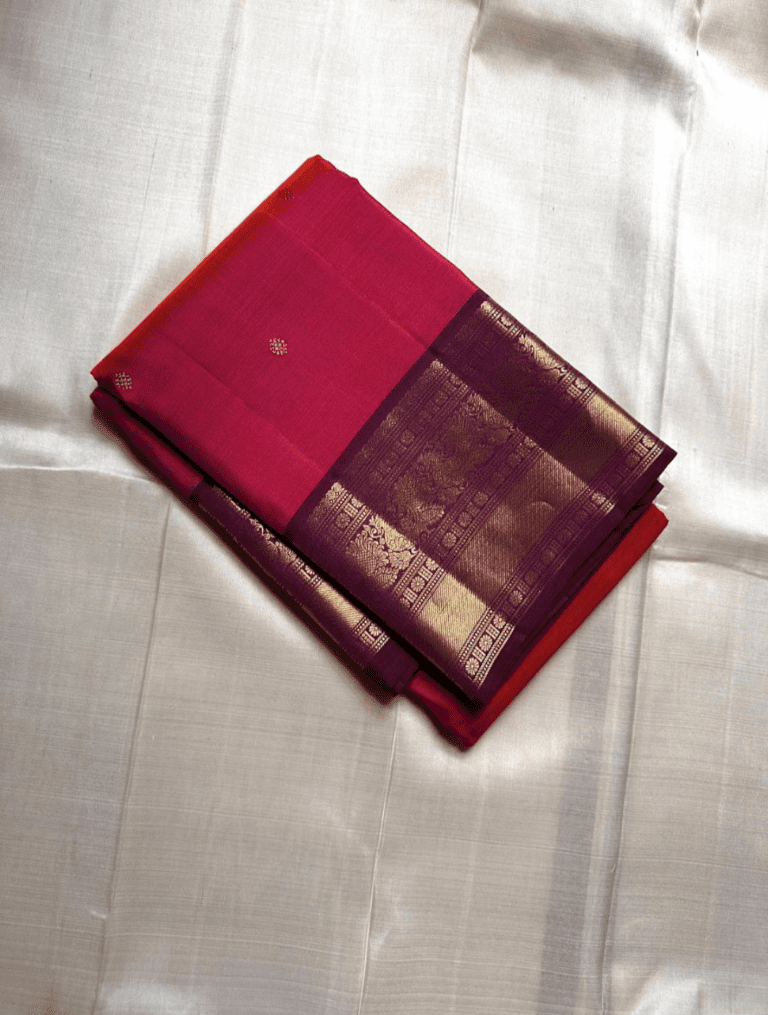 The Shubha saree, meaning ‘splendor,’ is a truly elegant and vibrant piece. Its beautiful peach-pink body is adorned with delicate golden buttas. ✨ The wide, rich purple border and pallu, featuring intricate traditional motifs, beautifully contrast with the body, giving this saree a regal and grand feel.