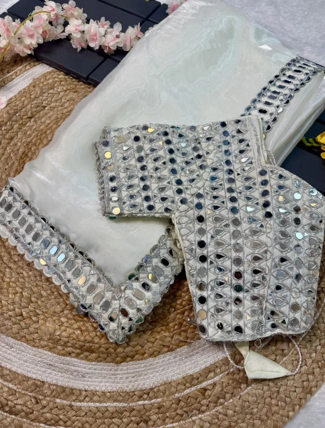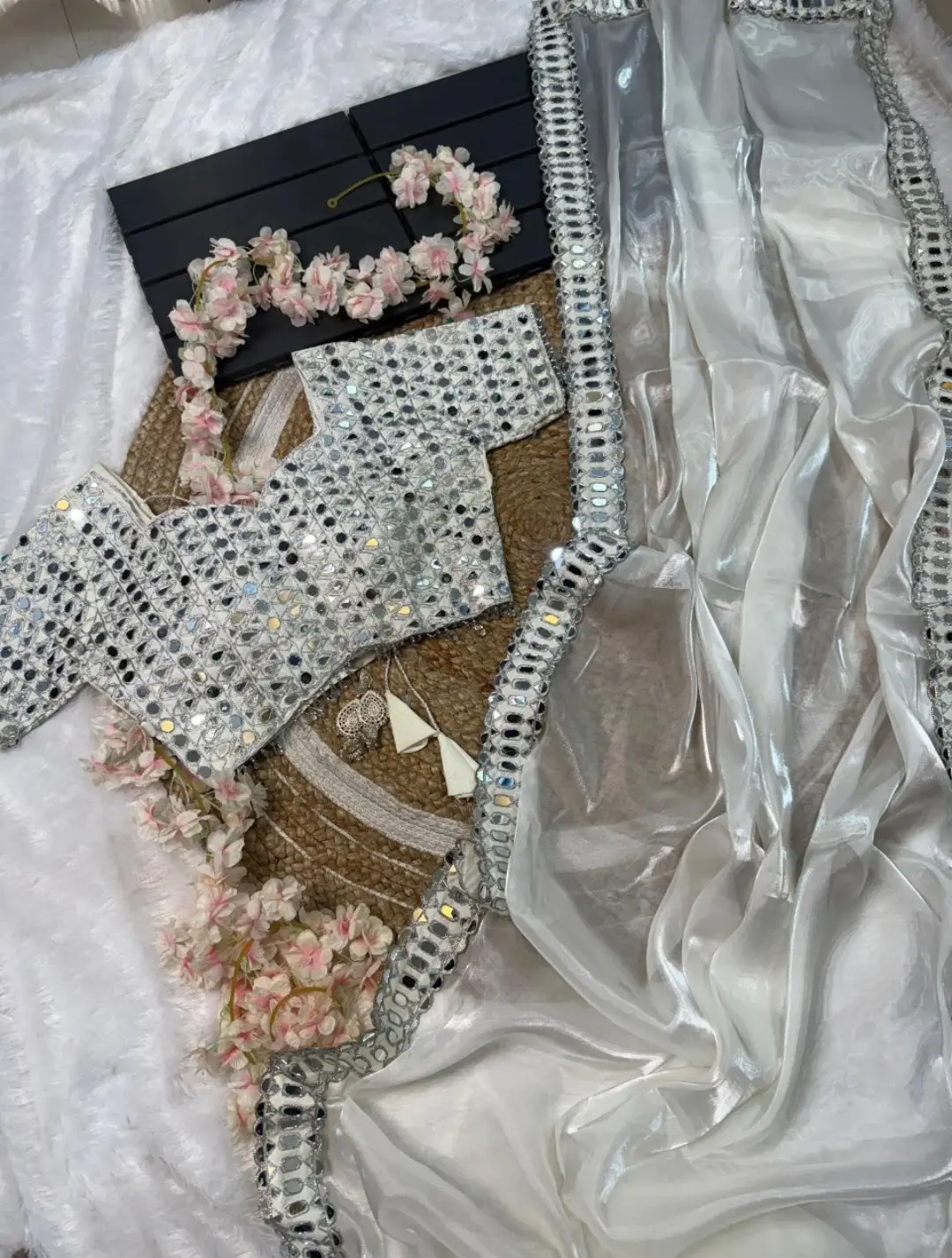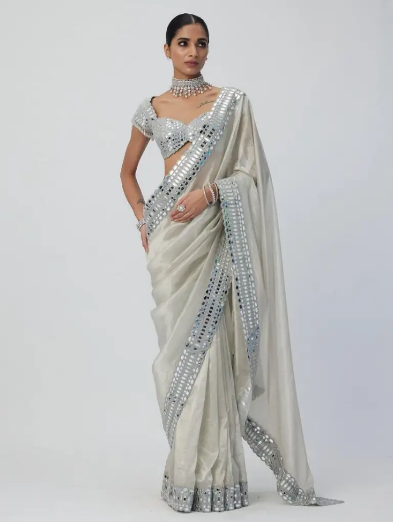 Silver-grey shimmering saree with a very wide, heavy border completely covered in mirror work. The blouse is a sleeveless, sweetheart neckline design, also fully covered in matching mirror work.