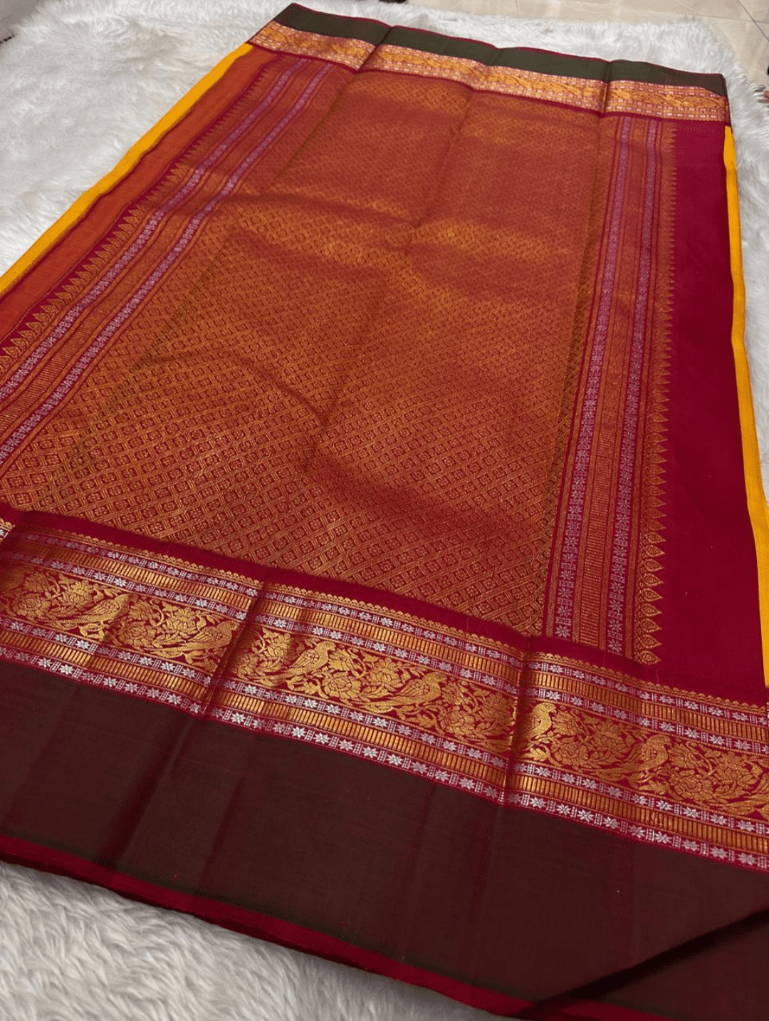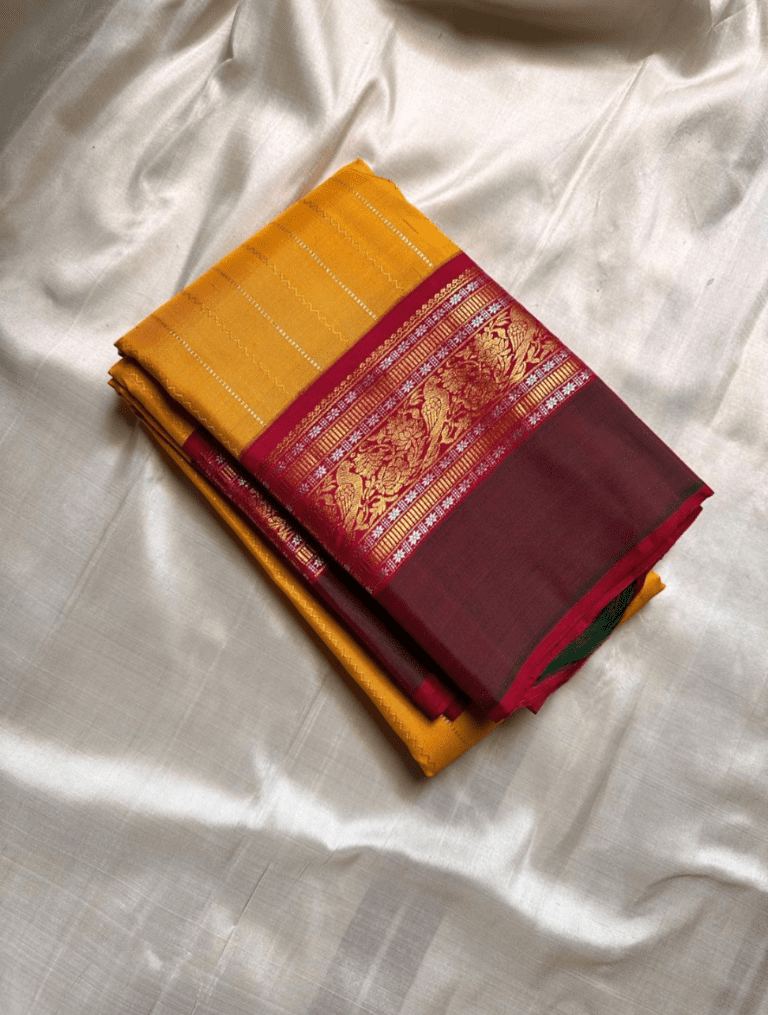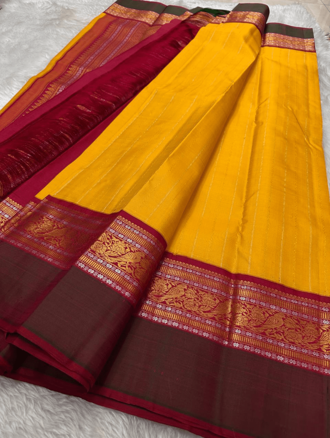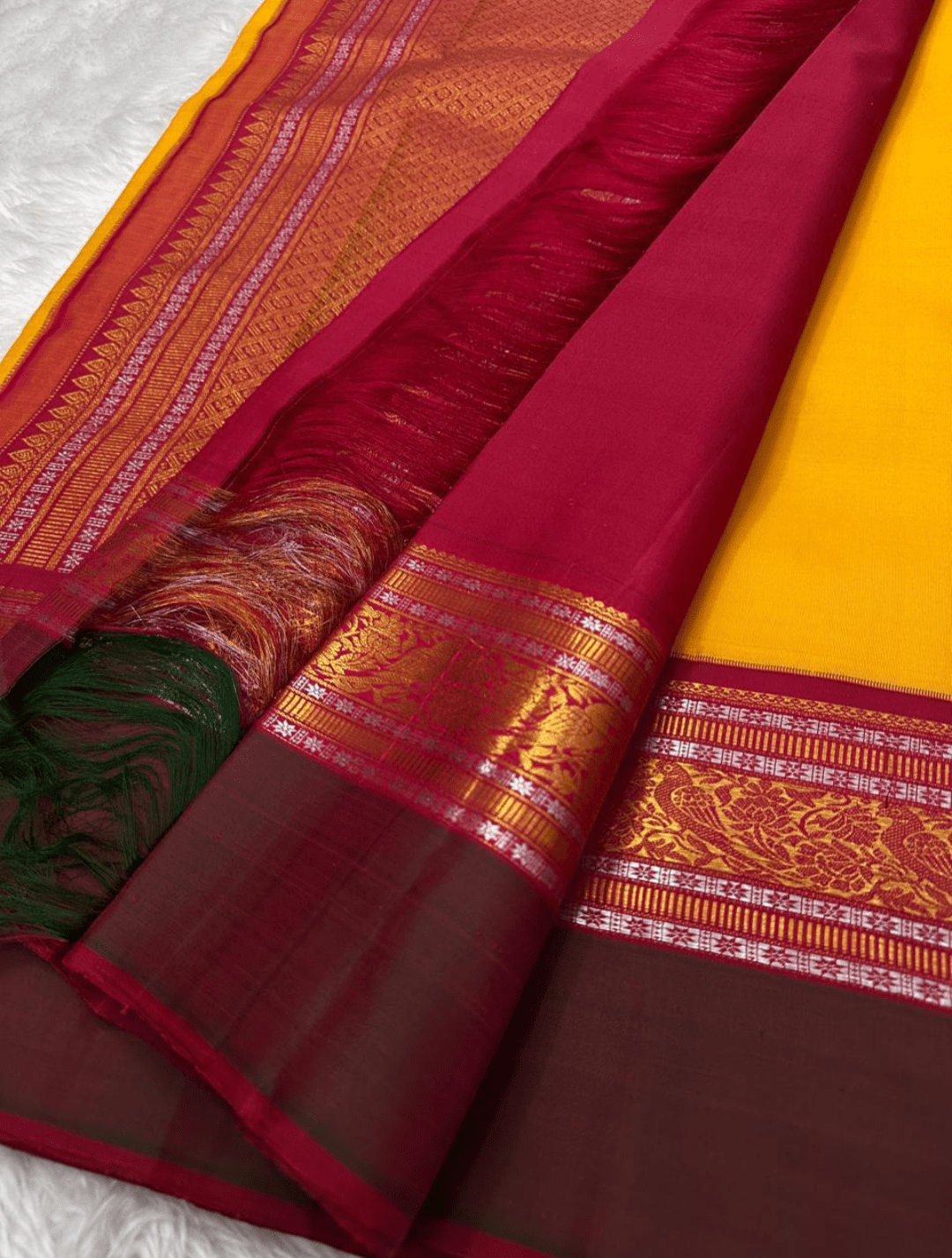 Color: A bright yellow body with a deep maroon and golden border, and a rich red and maroon pallu.