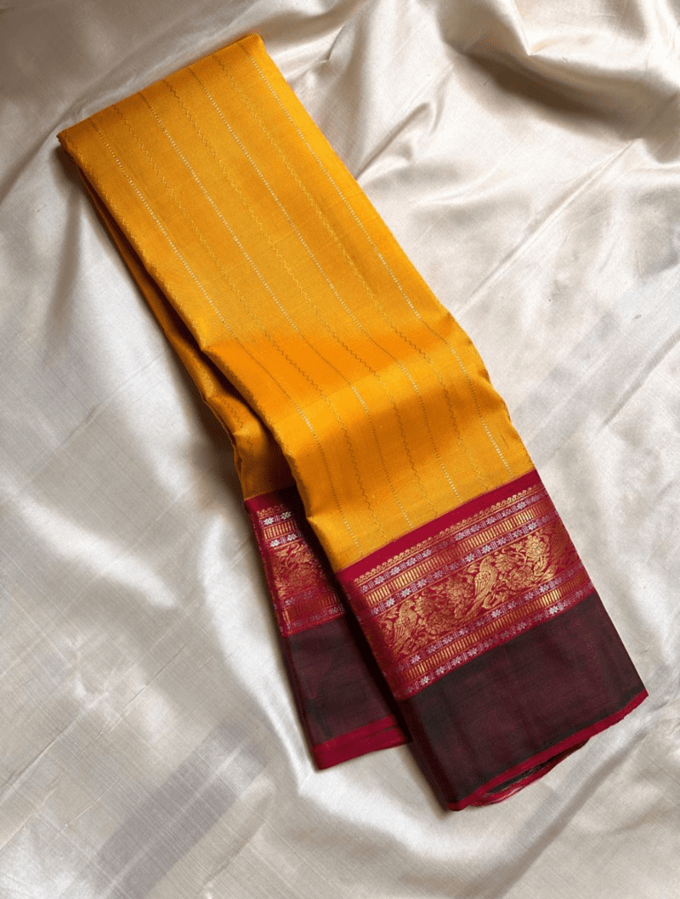 Surya is a vibrant saree that embodies the golden glow of the sun. The body is a bright yellow, radiating warmth and joy, subtly woven with delicate vertical stripes. This cheerful hue is perfectly contrasted by a wide, festive border in a rich maroon, which is exquisitely woven with intricate golden zari work featuring beautiful peacock motifs. The pallu, in a striking red and maroon, adds a final touch of festive charm.