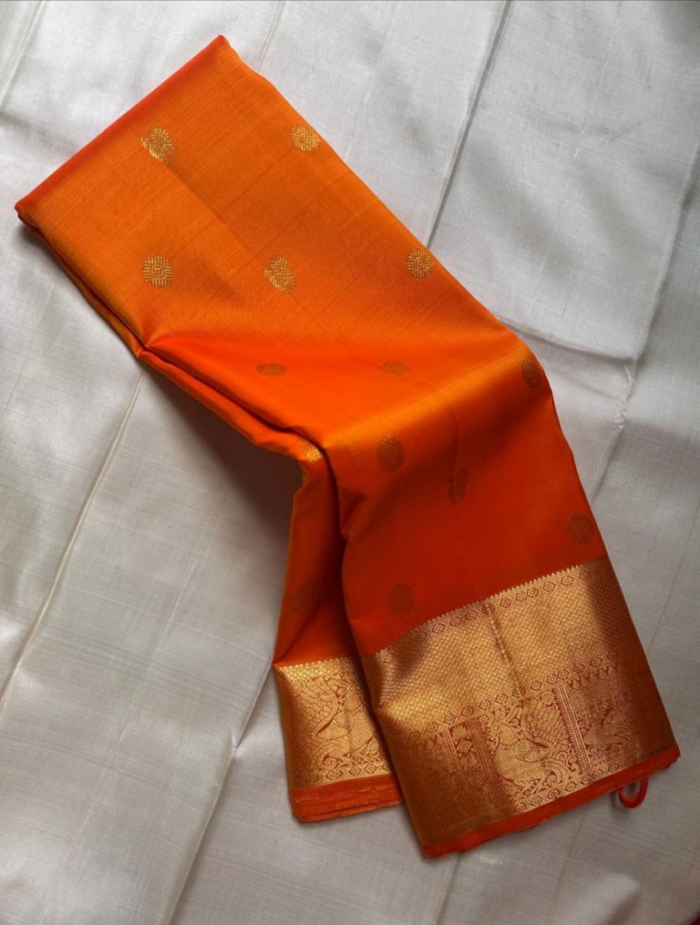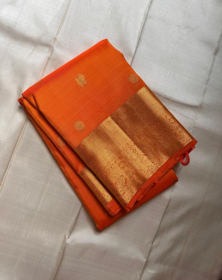 “Suryarekha,” meaning the golden rays of the sun, perfectly captures the brilliance of this saree. Woven in a vibrant orange silk body, the saree glows with gold zari buttas that add a touch of divine charm. The grand golden border and pallu.