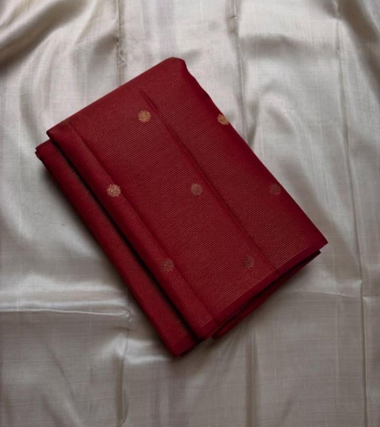 “Tanira” – means sacred beauty and strength. Tanira is a classic Kanjivaram silk saree that radiates understated elegance. The body is woven in a deep maroon shade, adorned with subtle golden buttas that enhance its refined charm. Its simplicity is beautifully balanced with rich traditional weaving.